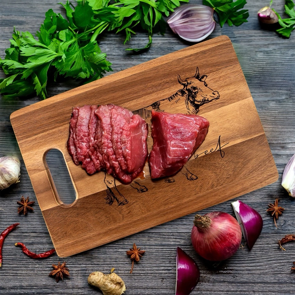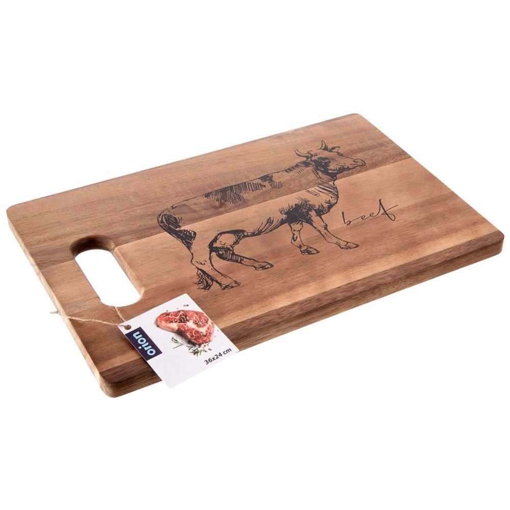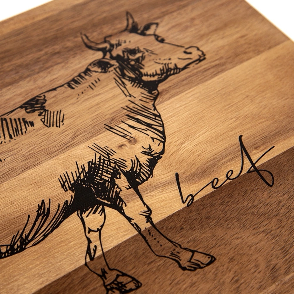 - Prostokątna deska do krojenia i serwowania. Wykonana z drewna akacjowego. Wyposażona w praktyczny uchwyt. Deska ma wyjątkowe, naturalne barwy i grafikę z napisem Beef.