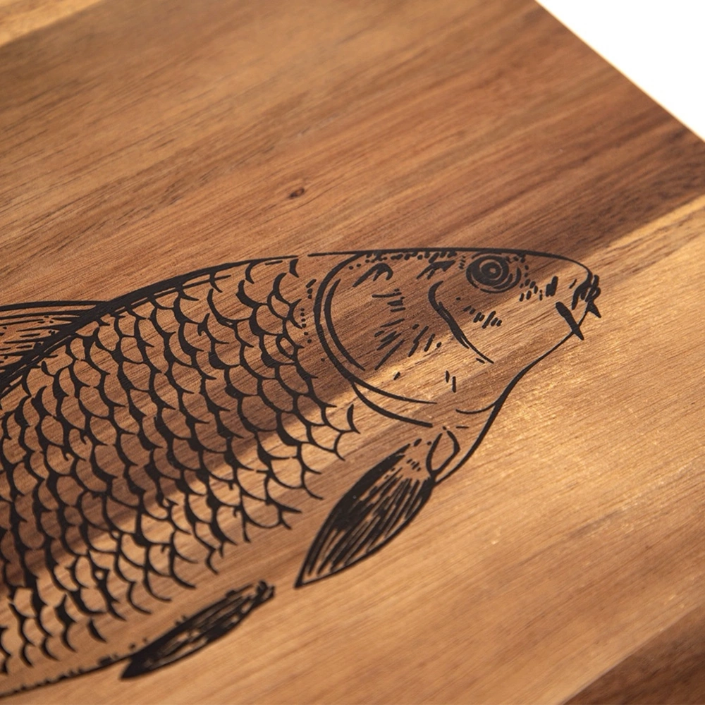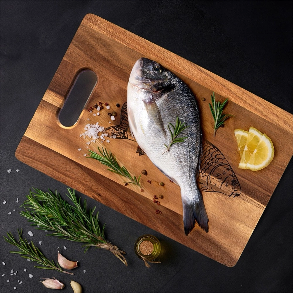 - Prostokątna deska do krojenia i serwowania. Wykonana z drewna akacjowego. Wyposażona w praktyczny uchwyt. Deska ma wyjątkowe, naturalne barwy i grafikę z napisem Fish.