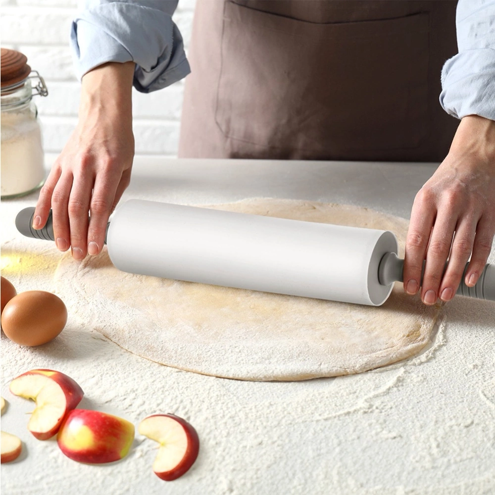 - Obrotowy wałek silikonowy posiada nieprzywierającą, powierzchnię. Dzięki temu nie przykleja się do ciasta i doskonale je rozwałkowuje, bez konieczności użycia dużej ilości mąki.