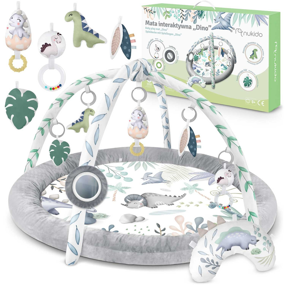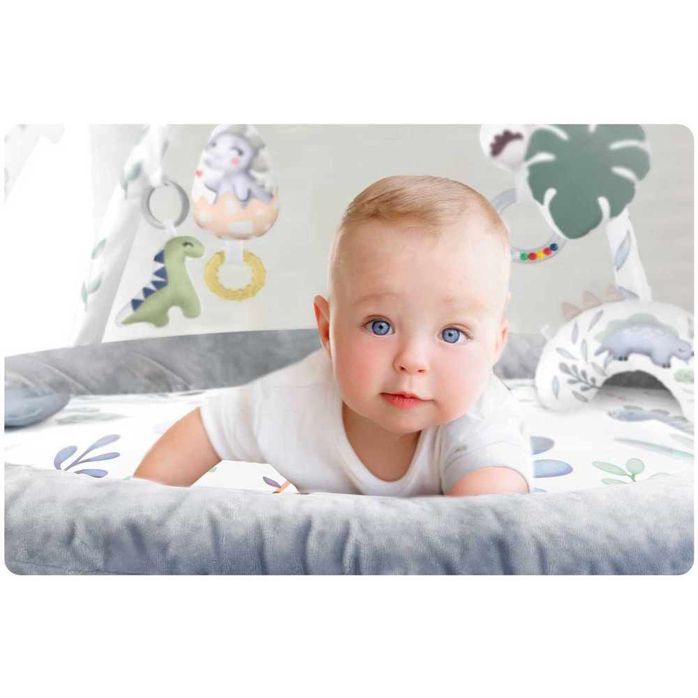 To właśnie dlatego do maty dołączamy multifunkcyjne zabawki, które możesz zwiesić na pałąkach — niech coś zagrzechocze, zadzwoni, a coś zaszeleści! Wśród zabawek jest nawet zabawka piszcząca — dinozaur i skamielina!