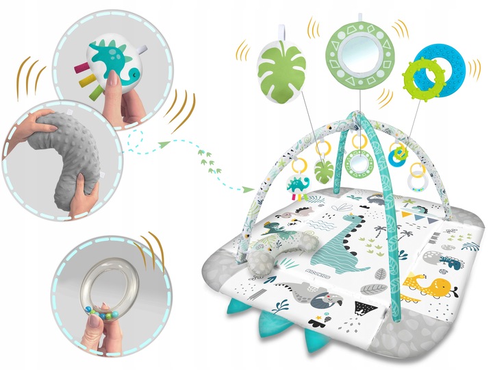 - Interaktywna mata edukacyjna 3w1 z poduszką i 7 zabawkami. Dwustronna, miękka i łatwa w czyszczeniu. Zapewnia bezpieczną zabawę i wspiera rozwój dziecka. Z pałąkami, lusterkiem i grzechotkami – idealna od pierwszych miesięcy życia.