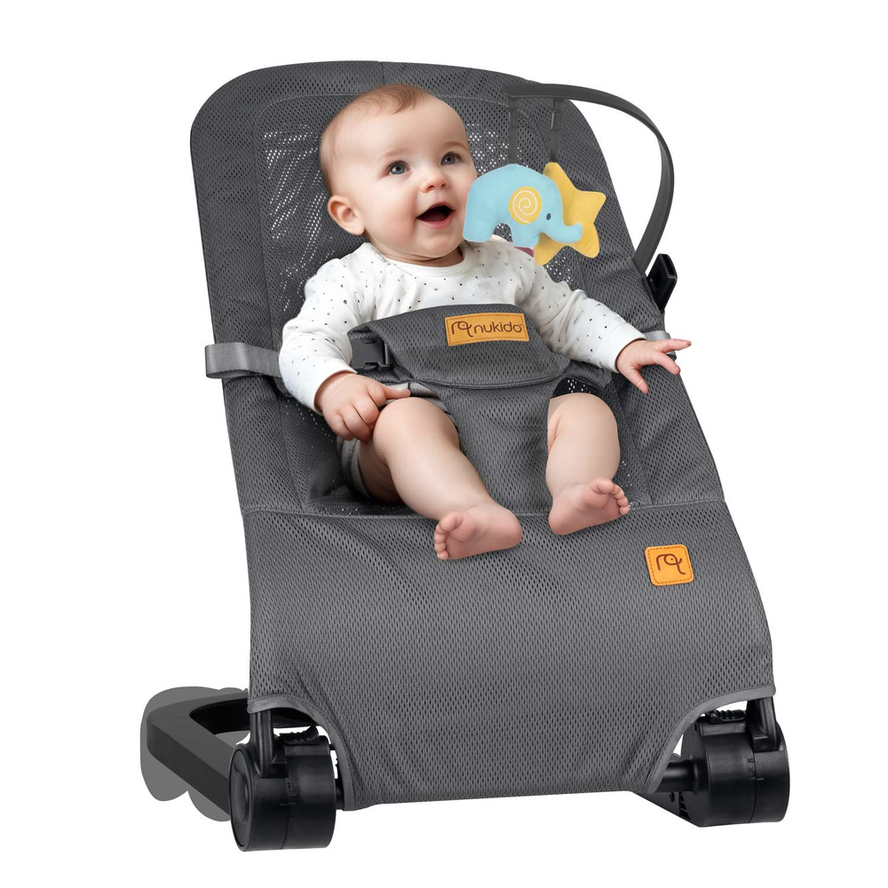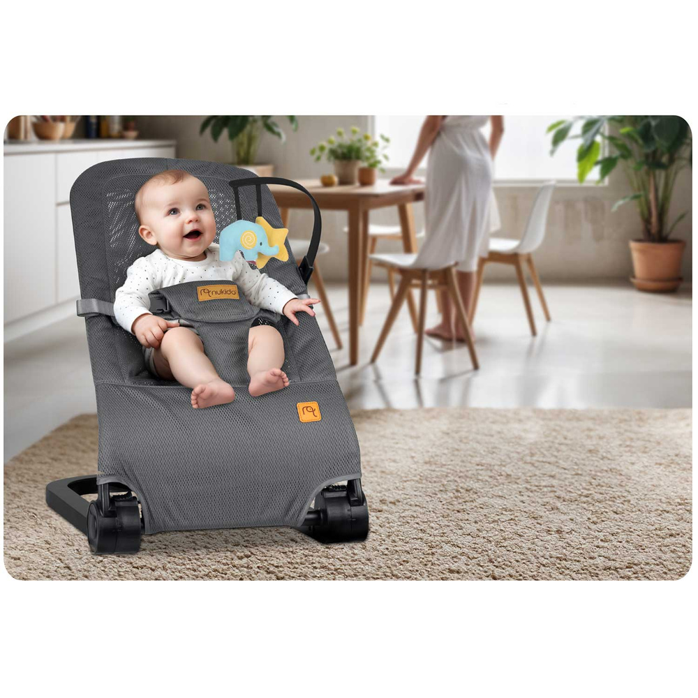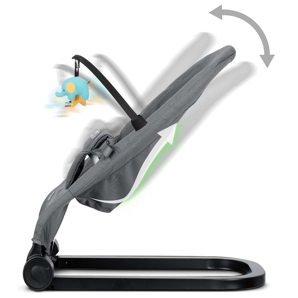 - Reakcja na ruchy: leżaczek reaguje na delikatne ruchy dziecka, wprawiając go w kojące bujanie.