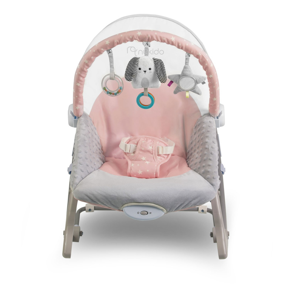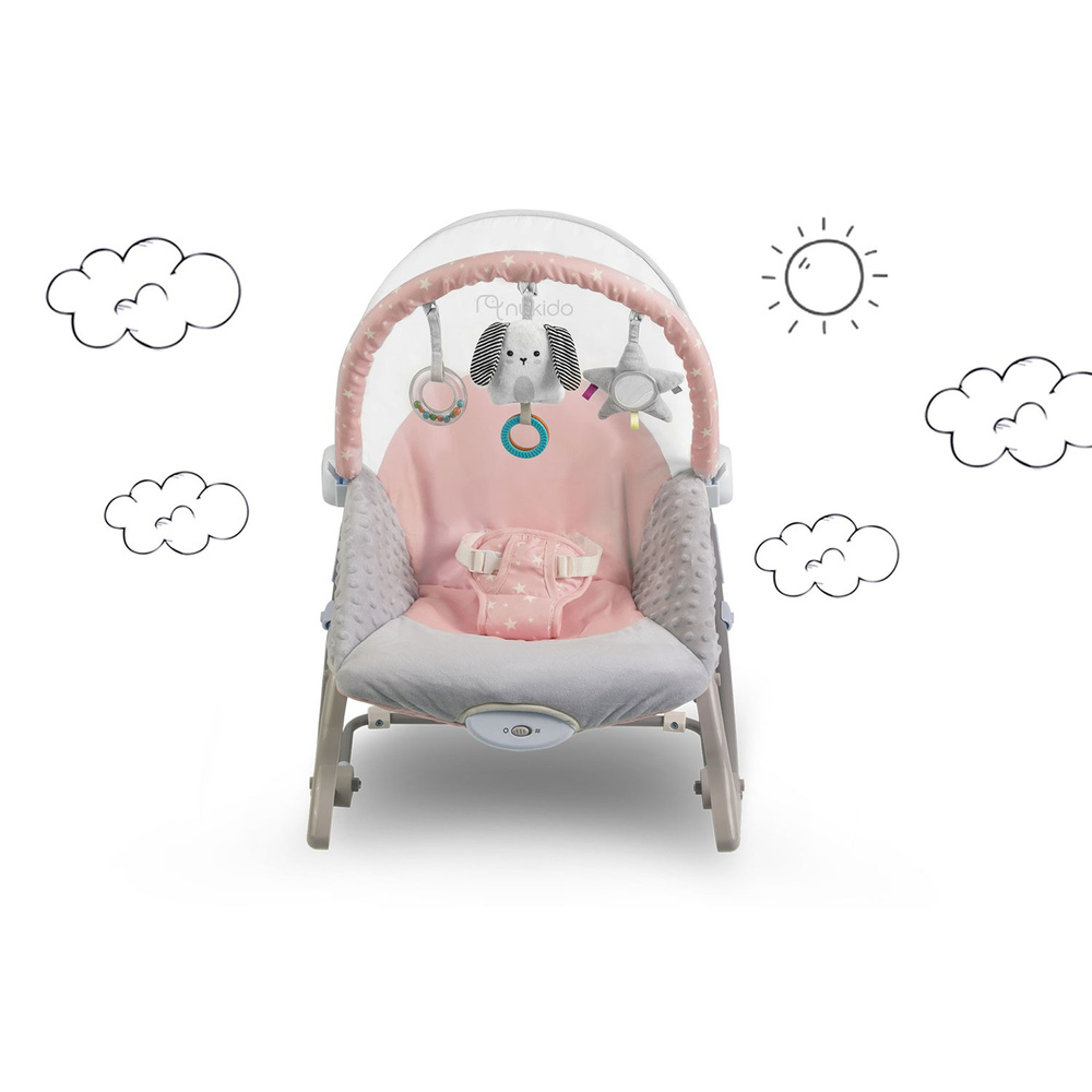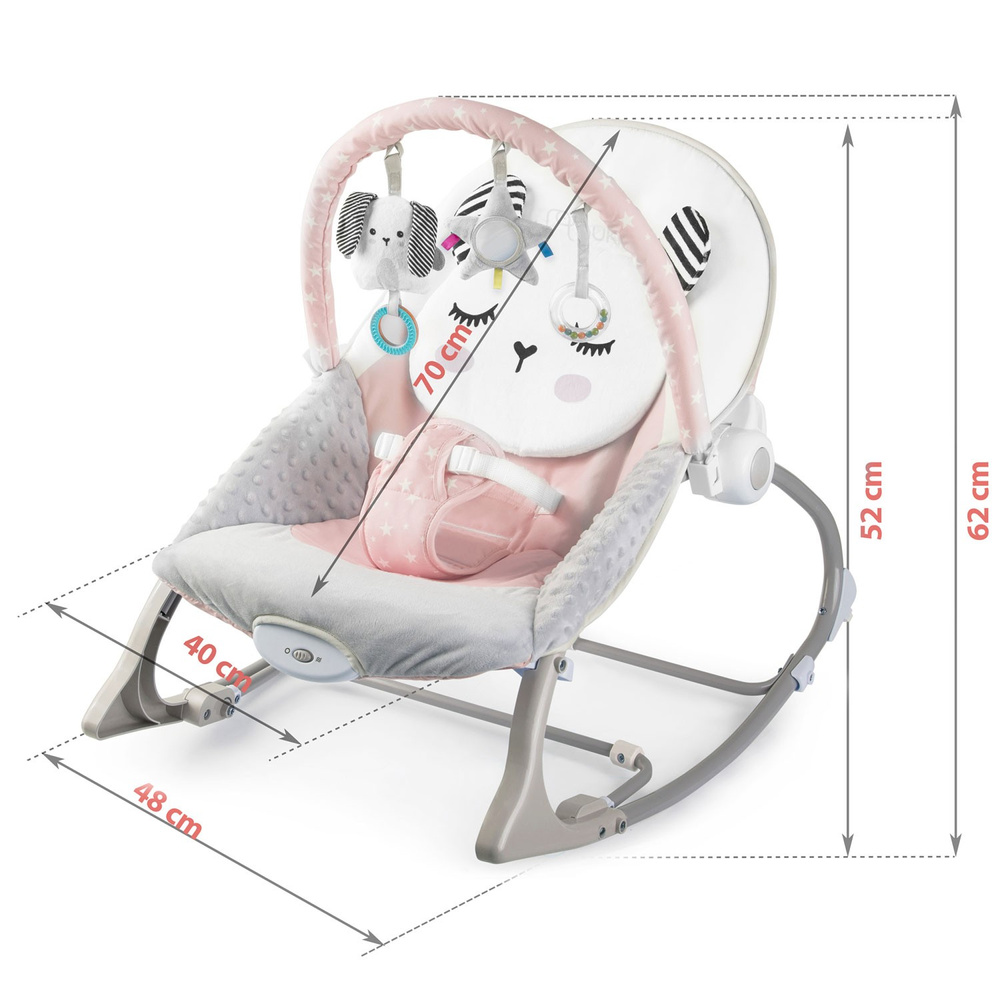 Leżaczek został wyposażony w zdejmowany pałąk z przyczepionymi szeleszczącymi zabawkami.. Zapewnią one Twojemu dziecku rozrywkę, podczas gdy Ty będziesz mógł odpocząć. Te wyjątkowe zabawki stymulują wzrok oraz rozwijają zmysł dotyku.