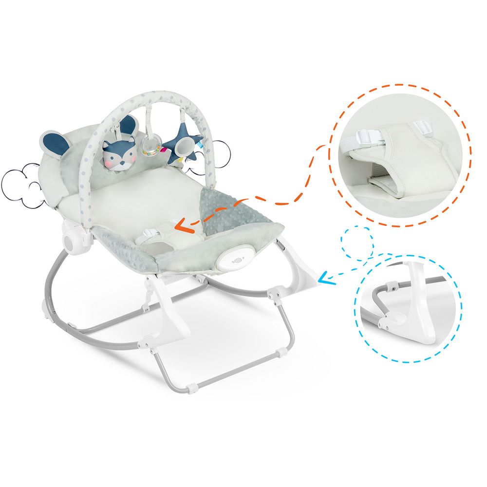 Leżaczek został wyposażony w zdejmowany pałąk z przyczepionymi szeleszczącymi zabawkami. Zapewnią one Twojemu dziecku rozrywkę, podczas gdy Ty będziesz mógł odpocząć. Te wyjątkowe zabawki stymulują wzrok oraz rozwijają zmysł dotyku.