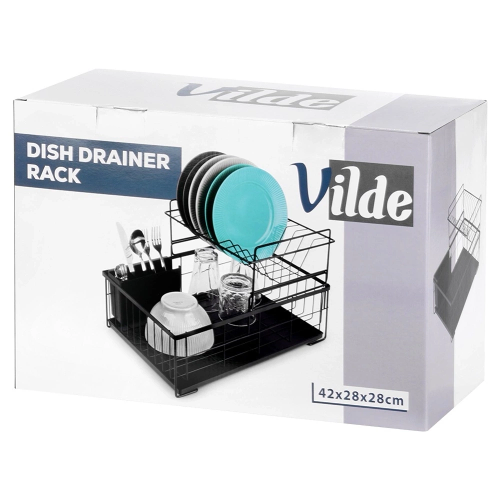 Dwupoziomowa, kompaktowa suszarka na naczynia z miejscem na talerze, sztućce oraz inne naczynia. Wykonana z wytrzymałych materiałów. Dzięki niej zapomnisz o nieuporządkowanych naczyniach i mokrych śladach na blacie szafek przy zlewie. Suszarka jest niezwykle pojemna, pozwala na równoczesne suszenie naczyń na dwóch poziomach. Niezbędny element wyposażenia kuchni. Oryginalny produkt marki Vilde. Wyprodukowano zgodnie z europejskimi standardami.