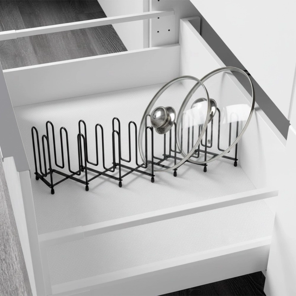 - Rozkładany organizer do przechowywania pięciu pokrywek, desek lub talerzy. Możemy przechowywać go na blacie lub umieścić w szafce, bądź głębokiej szufladzie.