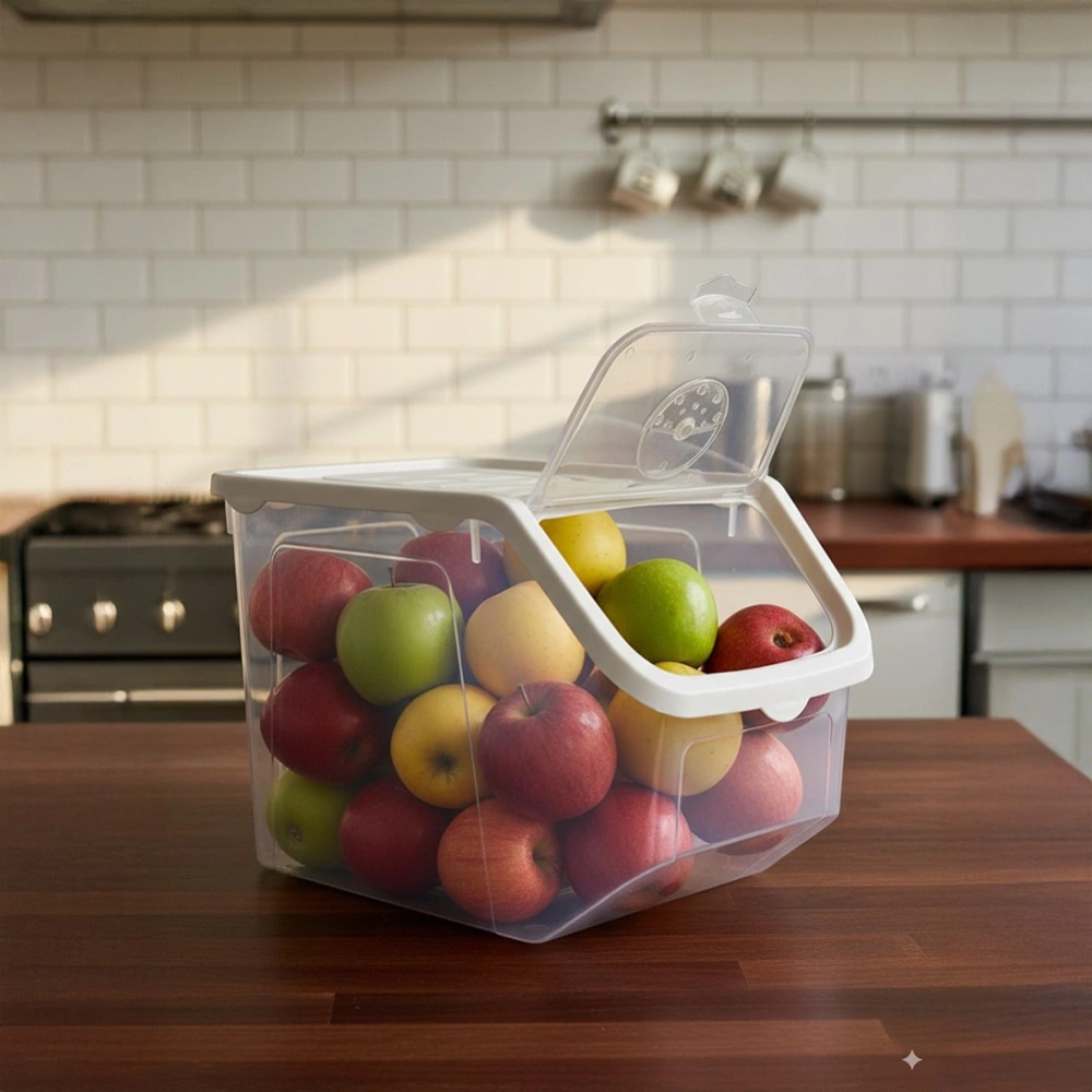 Praktyczny pojemnik do przechowywania warzyw, owoców oraz produktów sypkich. Posiada regulowaną wentylację, dzięki czemu owoce i warzywa zachowają dłużej swoją świeżość. Dzięki szczelnej pokrywie i wygodnemu systemowi dozowania, codzienne korzystanie jest wygodne i higieniczne. Oryginalny produkt marki Vilde. Wyprodukowano zgodnie z europejskimi standardami.