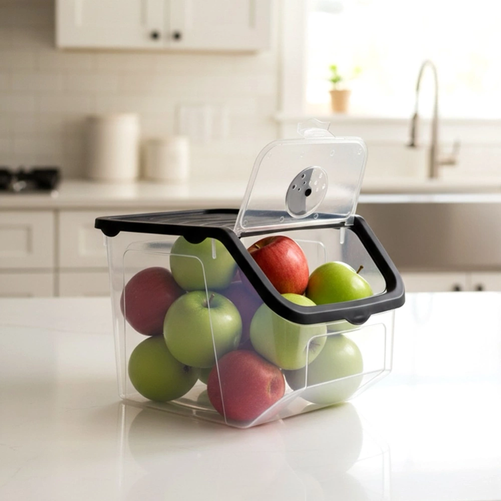 Praktyczny pojemnik do przechowywania warzyw, owoców oraz produktów sypkich. Posiada regulowaną wentylację, dzięki czemu owoce i warzywa zachowają dłużej swoją świeżość. Dzięki szczelnej pokrywie i wygodnemu systemowi dozowania, codzienne korzystanie jest wygodne i higieniczne. Oryginalny produkt marki Vilde. Wyprodukowano zgodnie z europejskimi standardami.