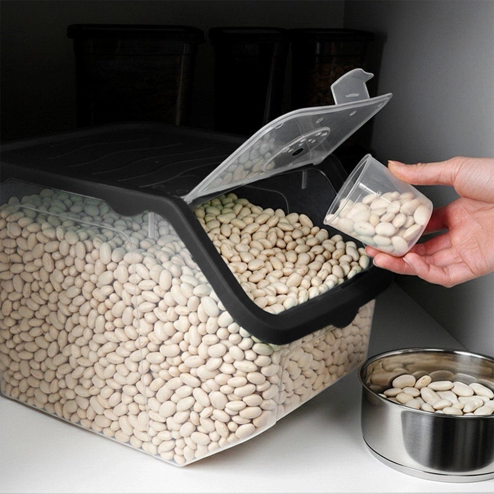 - Praktyczny pojemnik na różnego rodzaju produkty, owoce, warzywa. Pokrywka zamykana na klips, posiada regulacje wentylacji. W zestawie praktyczna miarka.