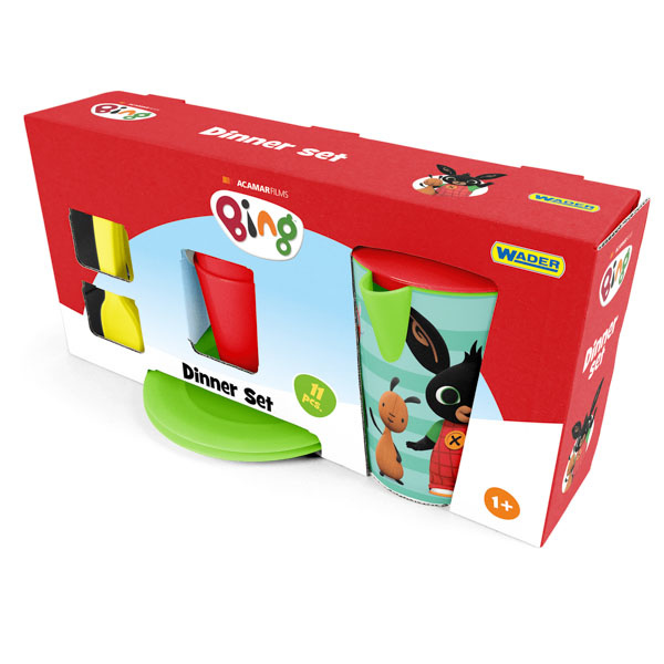 Zestaw naczyń obiadowy z wizerunkami bohaterów bajki Bing spodoba się każdemu miłośnikowi zabaw w gotowanie i organizowanie przyjęć i będzie doskonałym uzupełnieniem dziecięcej kuchni. Zestaw składa się z 11 elementów: dzbanka z grafiką IML, 2 kubków, 2 talerzyków, 2 widelców, 2 noży i 2 łyżeczek. Twoje dziecko będzie teraz mogło zaprosić koleżanki i kolegów lub organizować przyjęcie urodzinowe dla lalek.