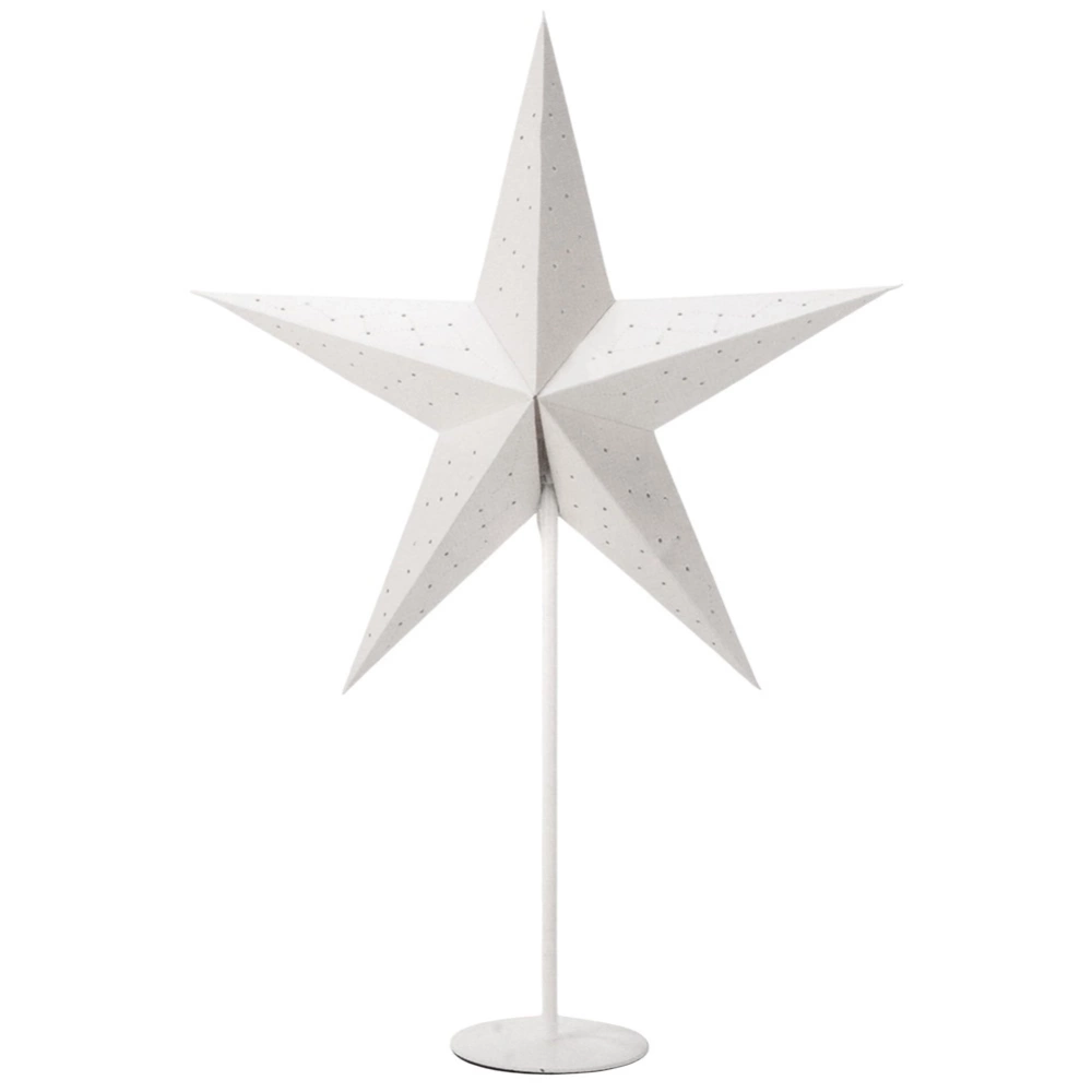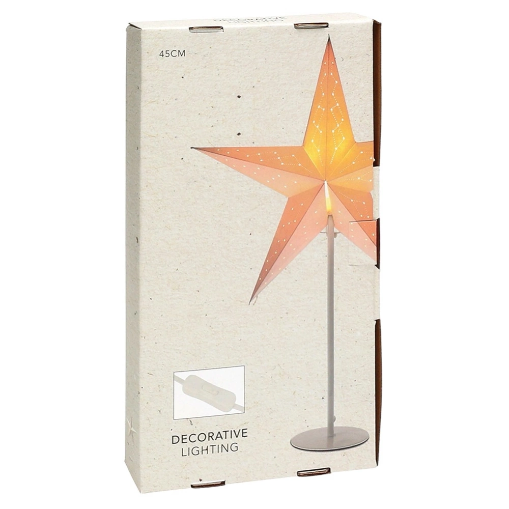 - Lampa stołowa o wysokości 65 cm z pięcioramienną, papierową gwiazdą o średnicy 45 cm w kolorze białym. Lampka przystosowana na żarówkę E14 (max. 6W).