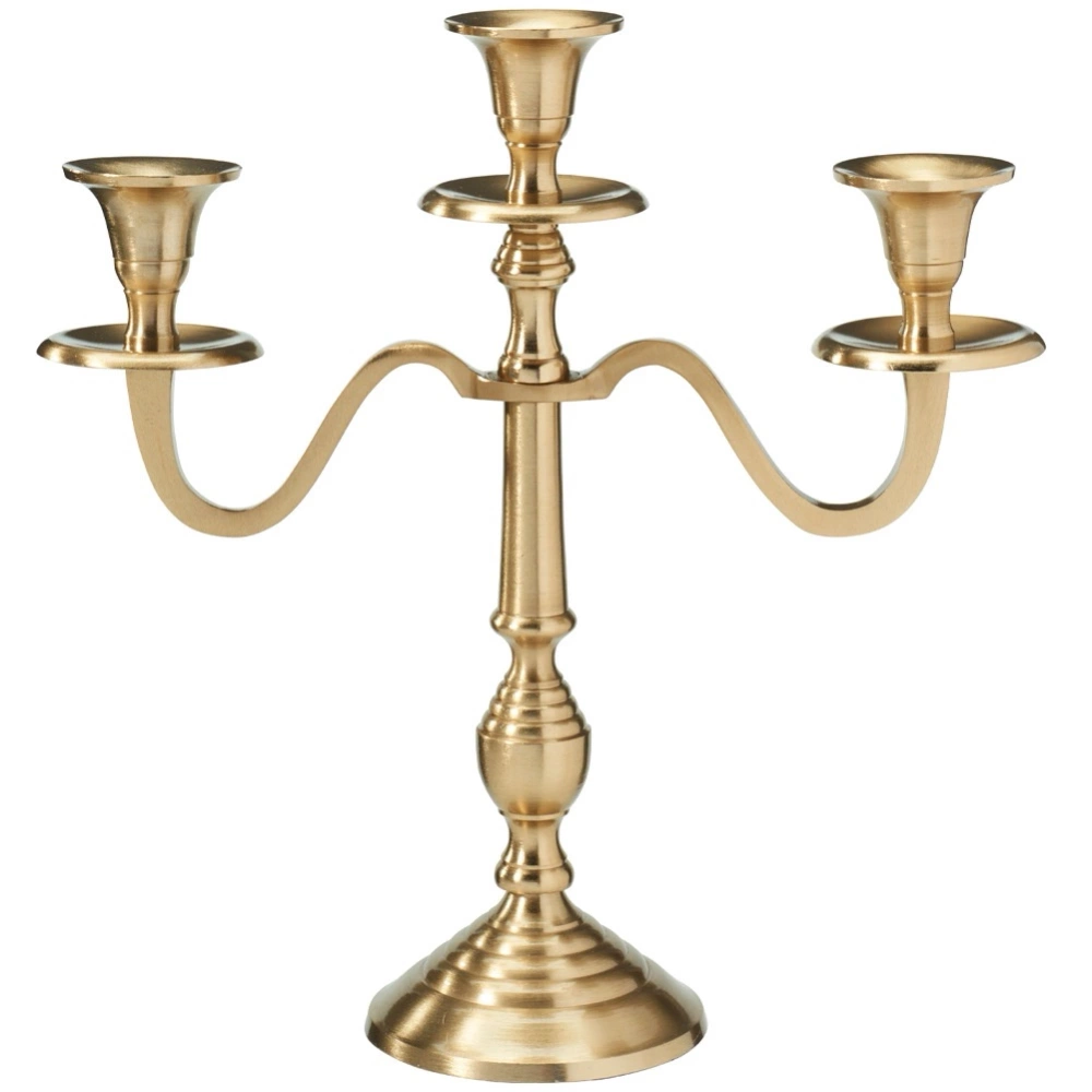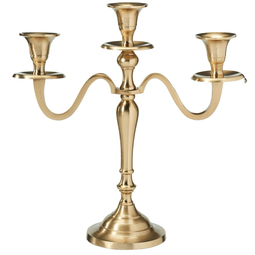 - Elegancki, trzyramienny kandelabr o wysokości 30 cm, przeznaczony na długie świece stołowe. Wykonany z aluminium w złotym kolorze.