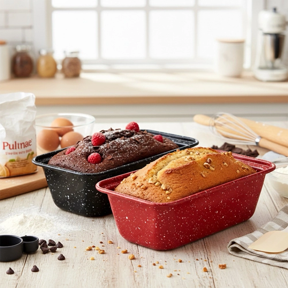 - Zestaw dwóch form do pieczenia chleba i ciast. Wykonane ze stali węglowej i pokryte powłoką nieprzywierającą. Idealne do przygotowywania chleba, pasztetów, zapiekanek czy słodkich keksów.