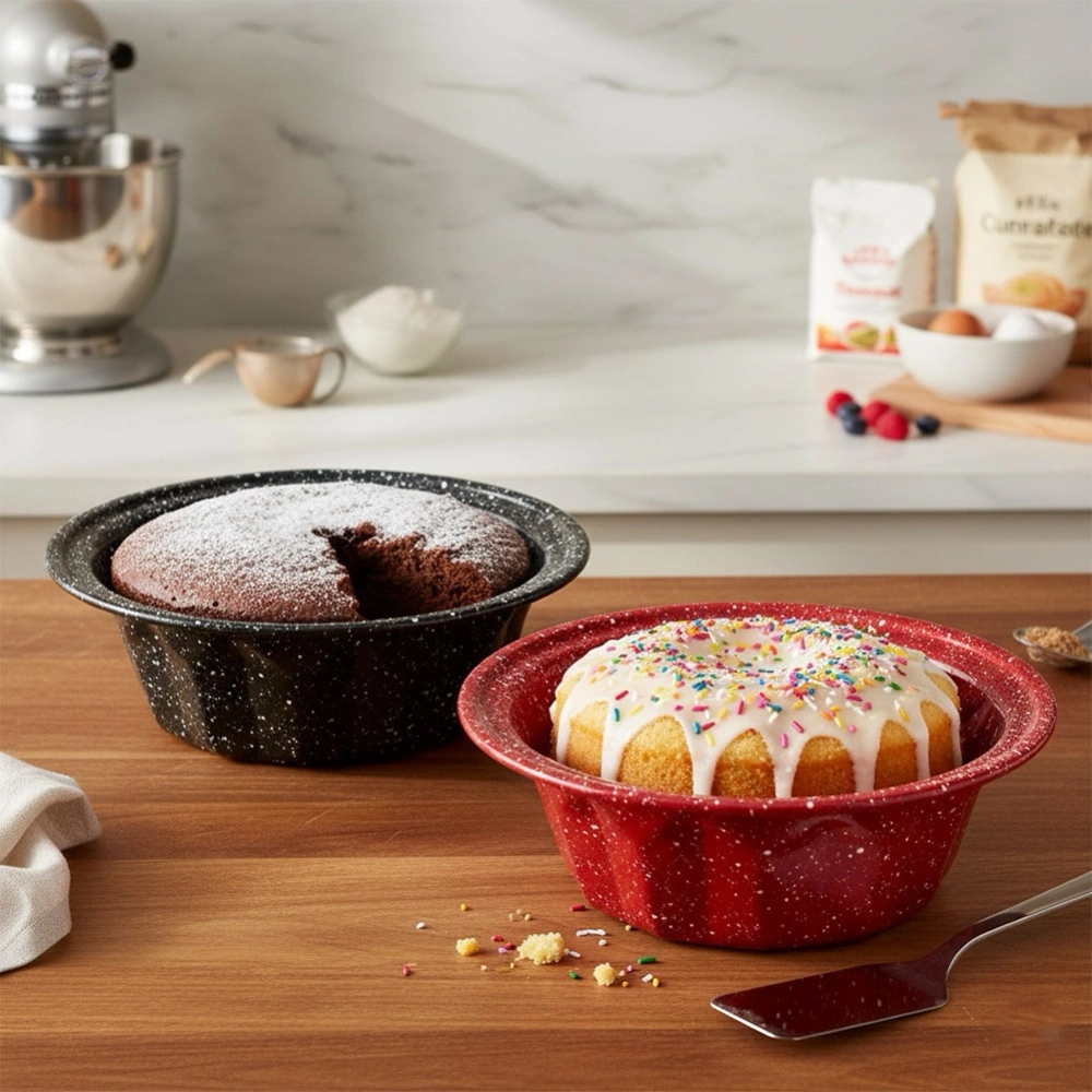 - Wykonane ze stali - Formy wykonane z najwyższej jakości stali węglowej w kolorze czarnym oraz czerwonym. Stal węglowa świetnie przewodzi ciepło. Zapewnia to równomierne pieczenie, dzięki czemu ciasto jest idealnie wypieczone z każdej strony. Materiał nie zawiera PFOA, dzięki czemu jest bezpieczny w kontakcie z żywnością.