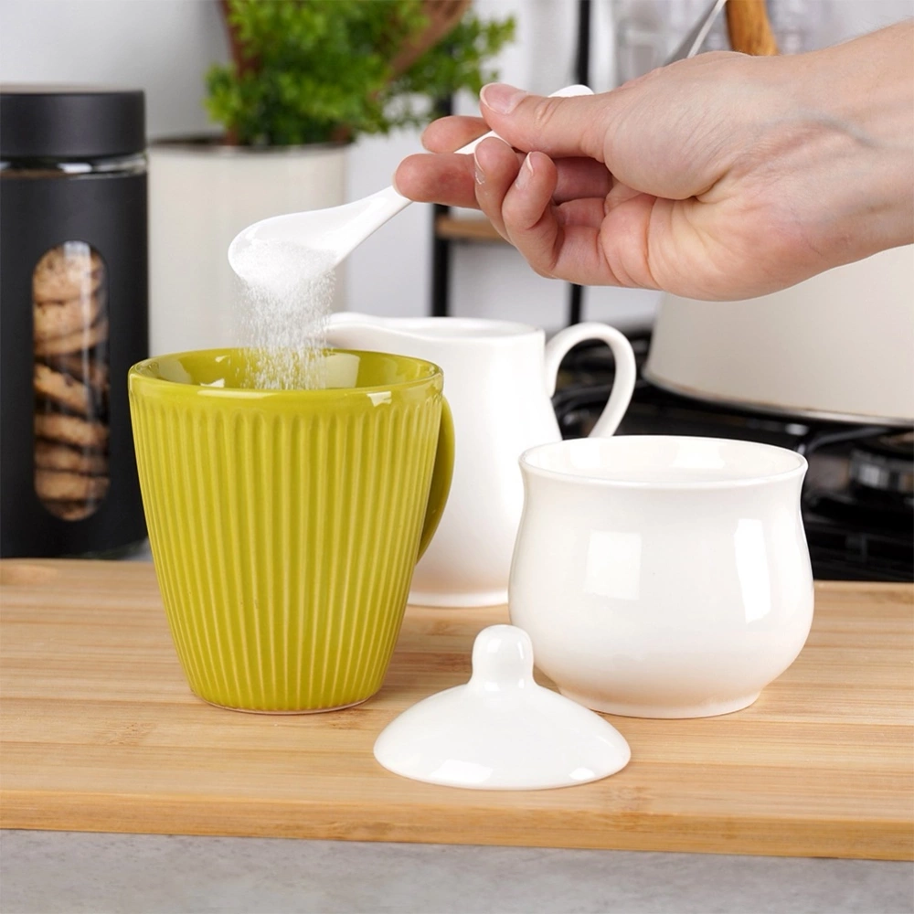- Wygodne w użytkowaniu - Dzbanuszek wyposażono w dzióbek oraz ergonomiczny uchwyt, a cukierniczka posiada pokrywkę z wygodnym uchwytem, wycięciem na łyżeczkę oraz łyżeczkę w zestawie.
