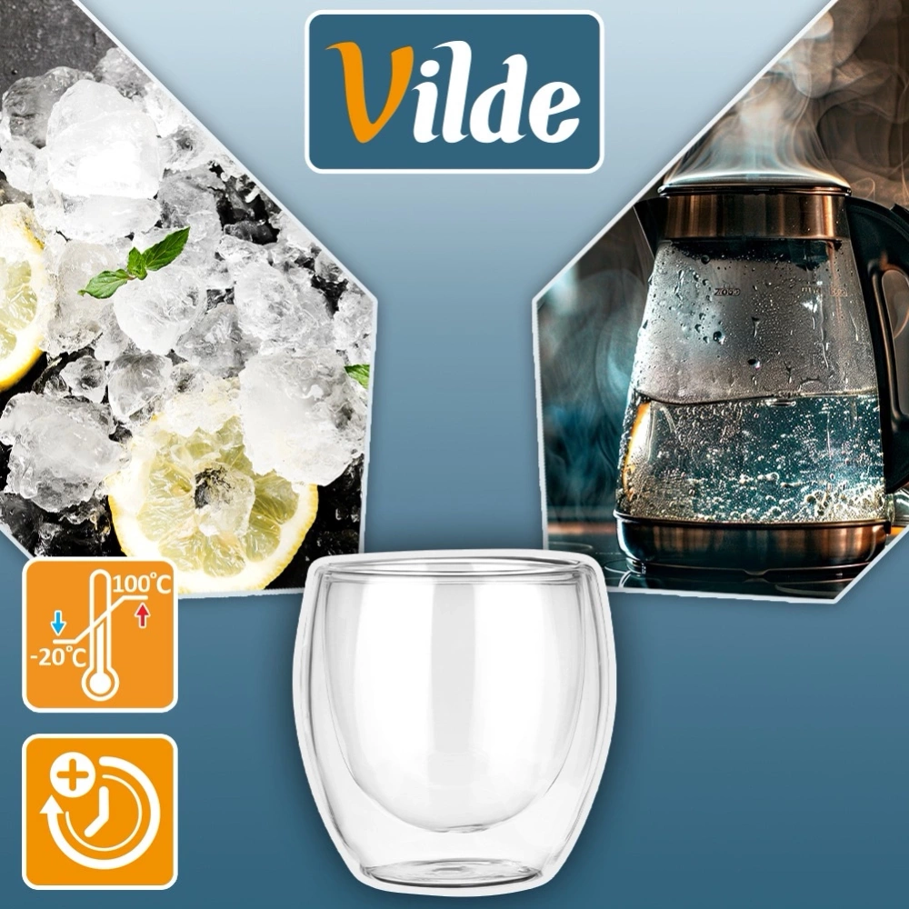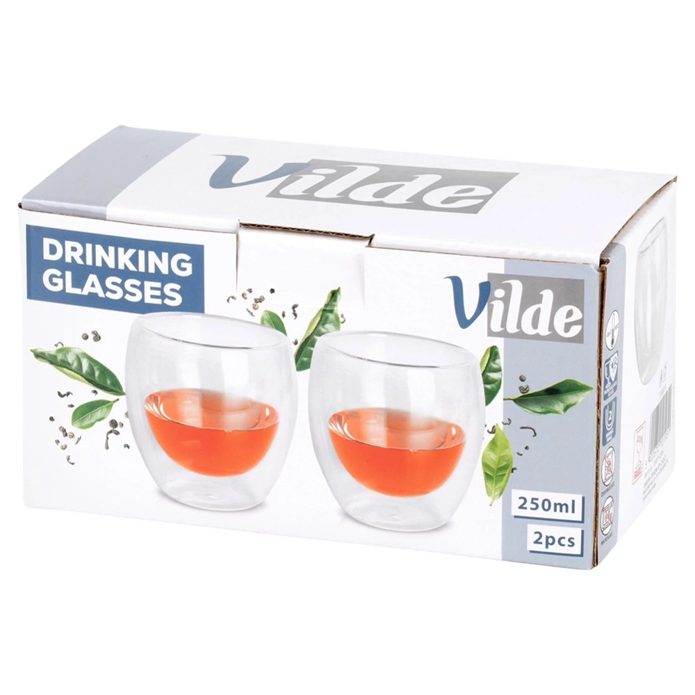 Komplet dwóch szklanek termicznych z podwójną ścianką. Szklanki mają nowoczesny design. Dzięki podwójnej ściance gorące napoje nie będą nas parzyły w ręce i szklanki pozwolą na utrzymanie dłużej ciepłej temperatury, to samo dotyczy chłodnych napojów. Idealne do picia ulubionej kawy, herbaty i innych napojów. Szklanki są świetnym pomysłem na prezent. Oryginalny produkt marki Vilde. Wyprodukowano zgodnie z europejskimi standardami.
