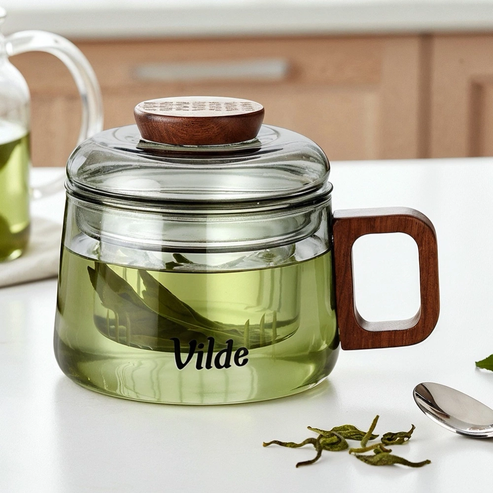 - Wyjmowany szklany zaparzacz - Posiada praktyczny zaparzacz z drobnymi otworami, który skutecznie zatrzymuje liście herbaty i zioła. Po zaparzeniu można go wyjąć, a napój pozostaje klarowny.