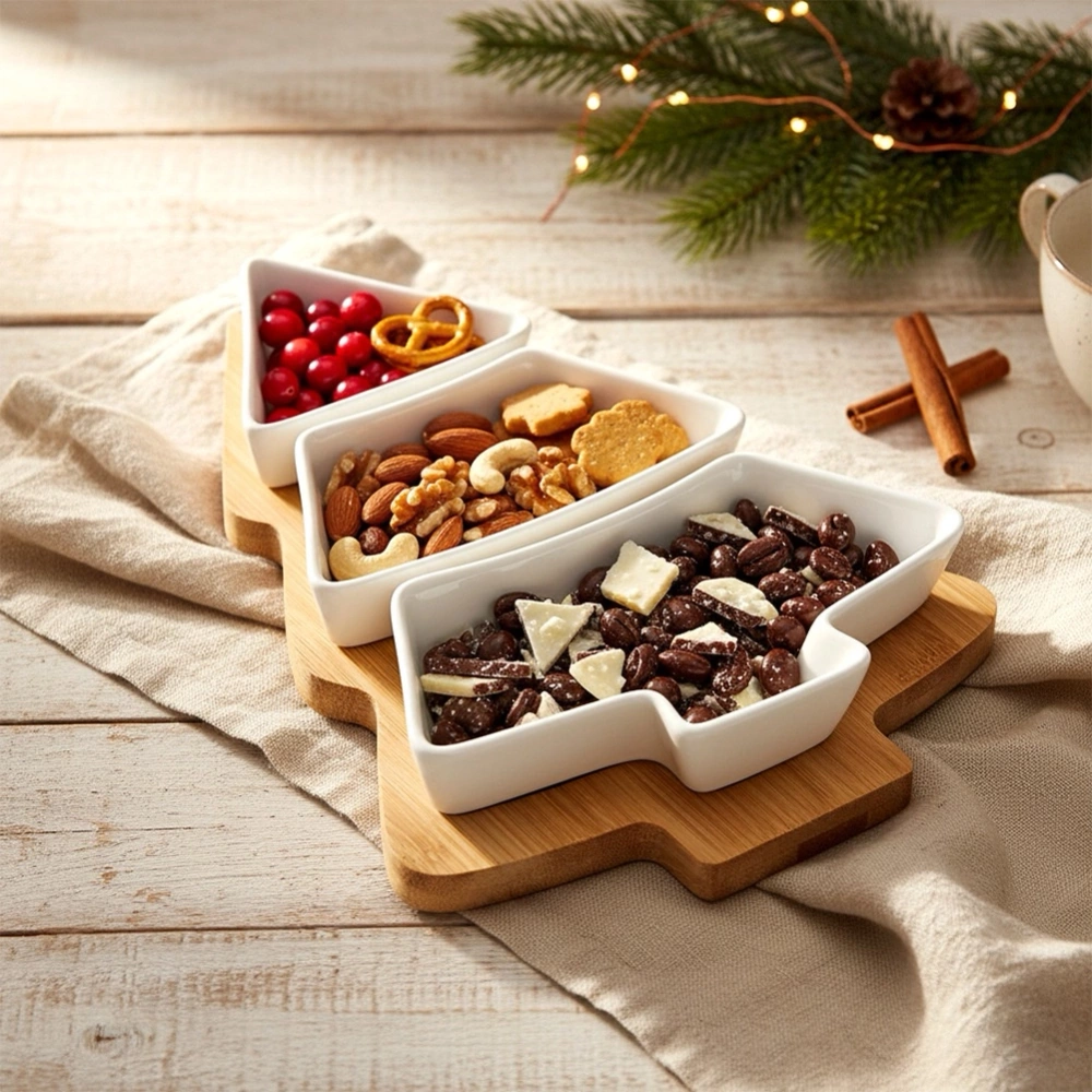 - 4-elementowy zestaw do serwowania przekąsek. Zawiera trzy białe, porcelanowe miseczki oraz bambusową tacę w kształcie choinki. Idealne do serwowania przekąsek, przystawek, sosów, dipów.