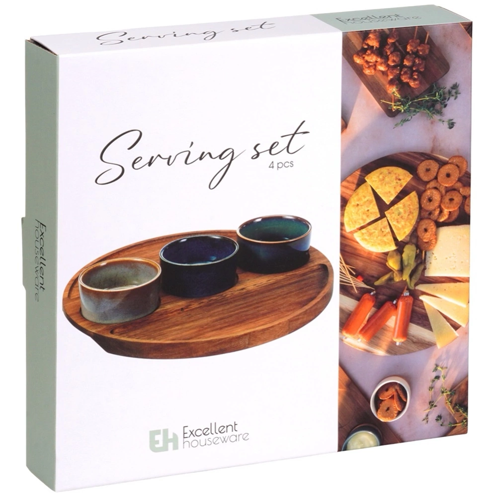 - 4-elementowy zestaw do serwowania przekąsek. Zawiera trzy ceramiczne miseczki oraz okrągłą tacę z drewna akacjowego. Idealne do serwowania przekąsek, sosów, dipów.