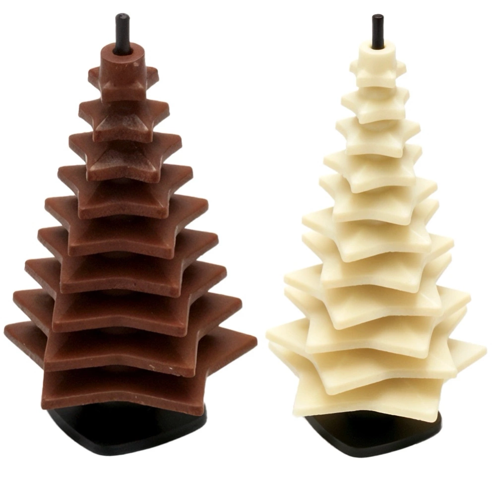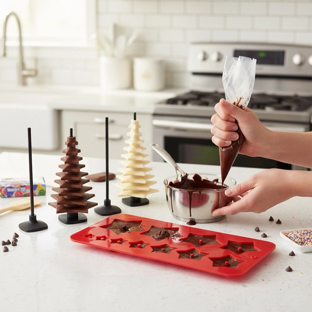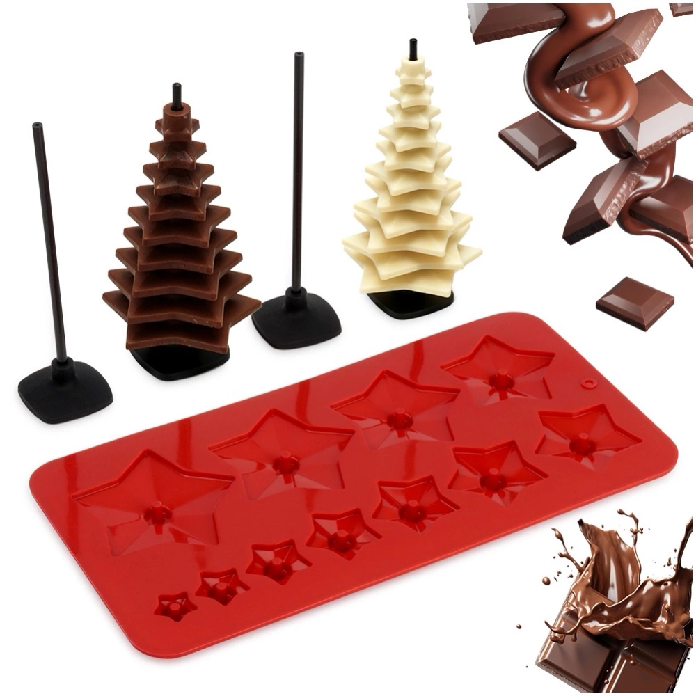 - Idealna do tworzenia czekoladowych choinek - Z pomocą formy i akcesoriów można stworzyć efektowne czekoladowe choinki, nabijając gwiazdki na patyczek od największej do najmniejszej.