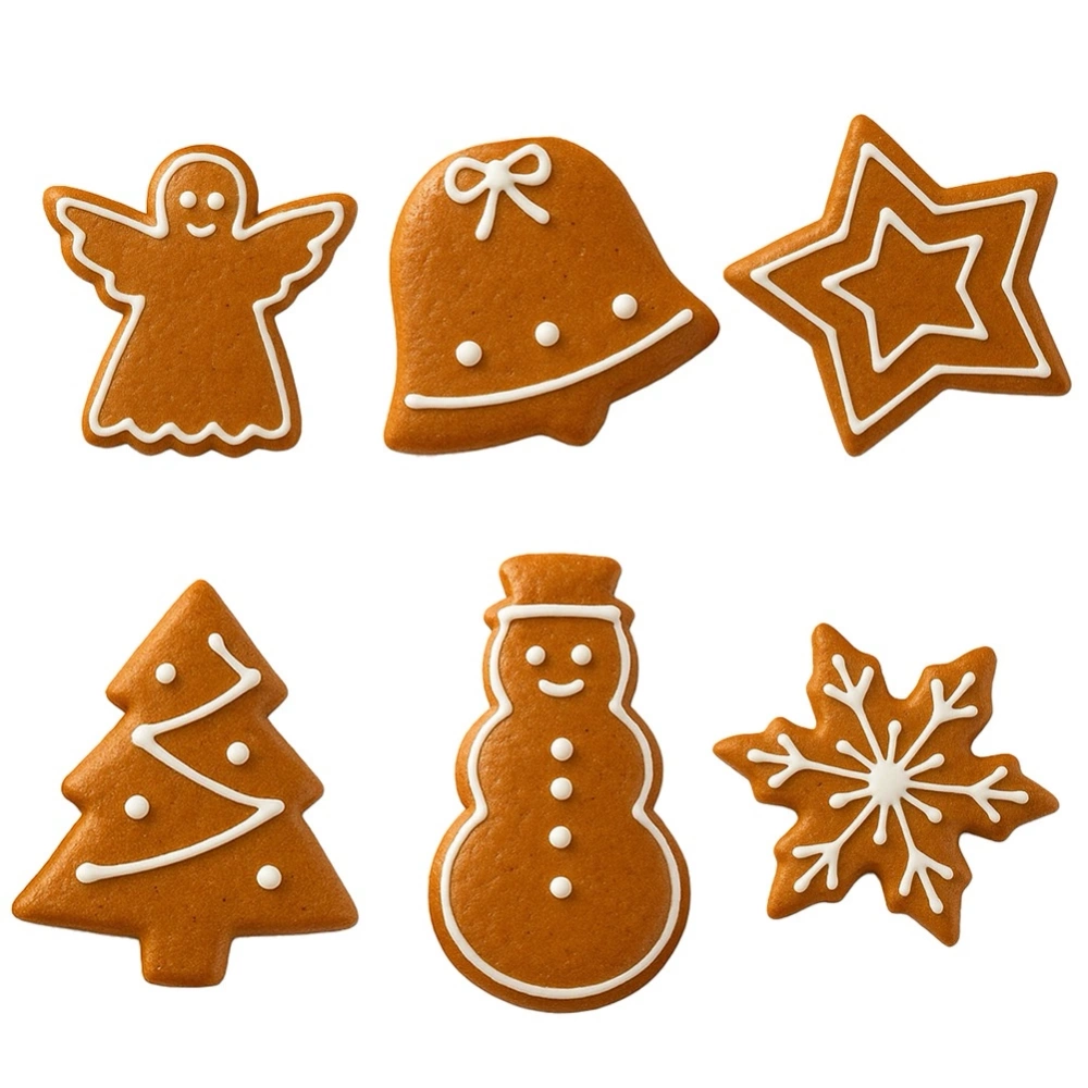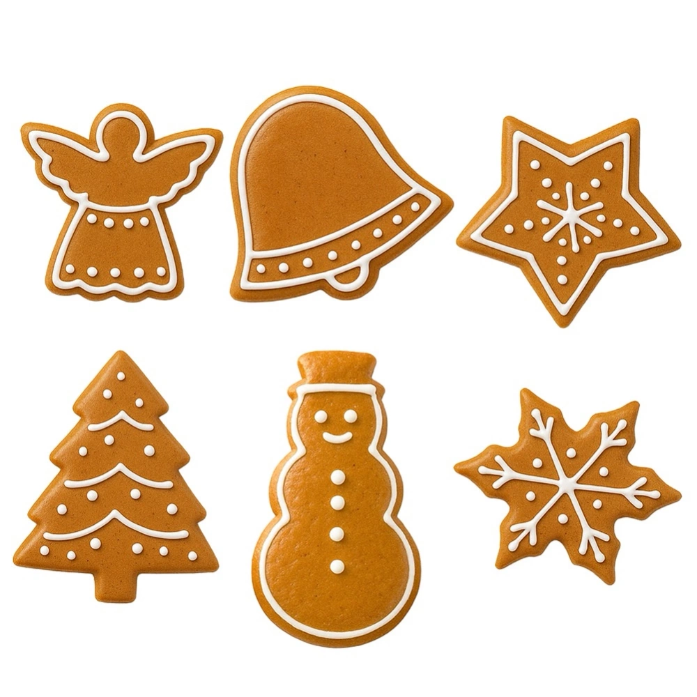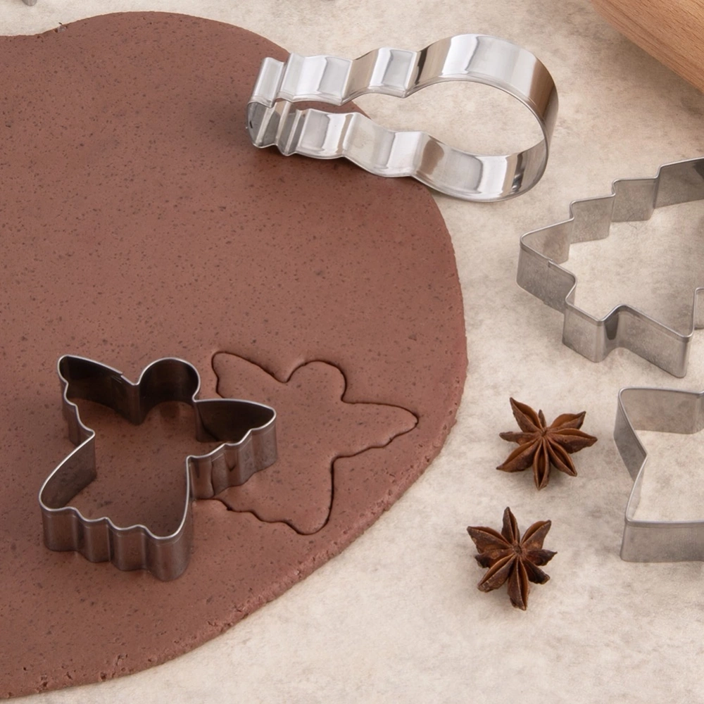 - Zestaw sześciu wykrawaczy w kształcie: anioła, dzwonu, gwiazdki, płatka śniegu, choinki i bałwana. Wykonane ze stali nierdzewnej. Idealne do wykrawania ciasteczek i pierników.