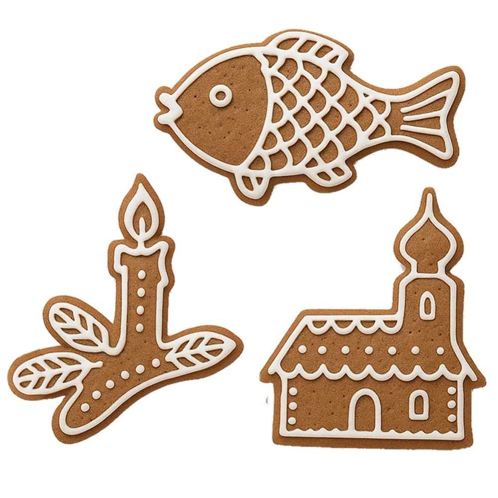- Zestaw trzech wykrawaczy w kształcie: kościoła, ryby i świeczki. Wykonane ze stali nierdzewnej. Idealne do wykrawania ciasteczek i pierników.