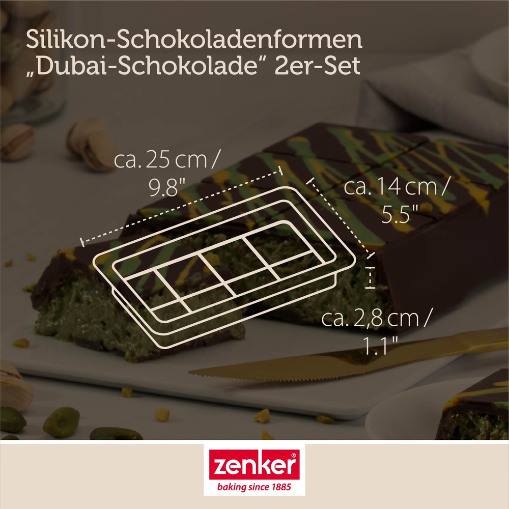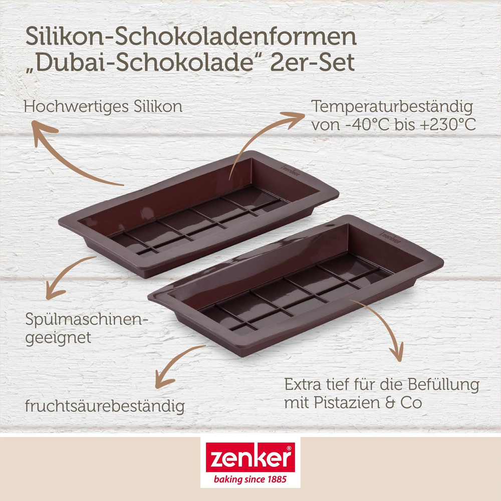 Miłośnicy czekolady, uwaga! Z zestawem 2 form do czekolady Dubai od Zenker przygotowanie popularnej czekolady staje się dziecinnie proste. Te innowacyjne formy oferują głębokie wgłębienia, które umożliwiają łatwe napełnianie pysznym nadzieniem pistacjowym. Klasyczny wzór kratki z ekstra dużymi kawałkami czekolady zapewnia nie tylko wyjątkowy smak, ale także atrakcyjny wygląd gotowych słodkości.