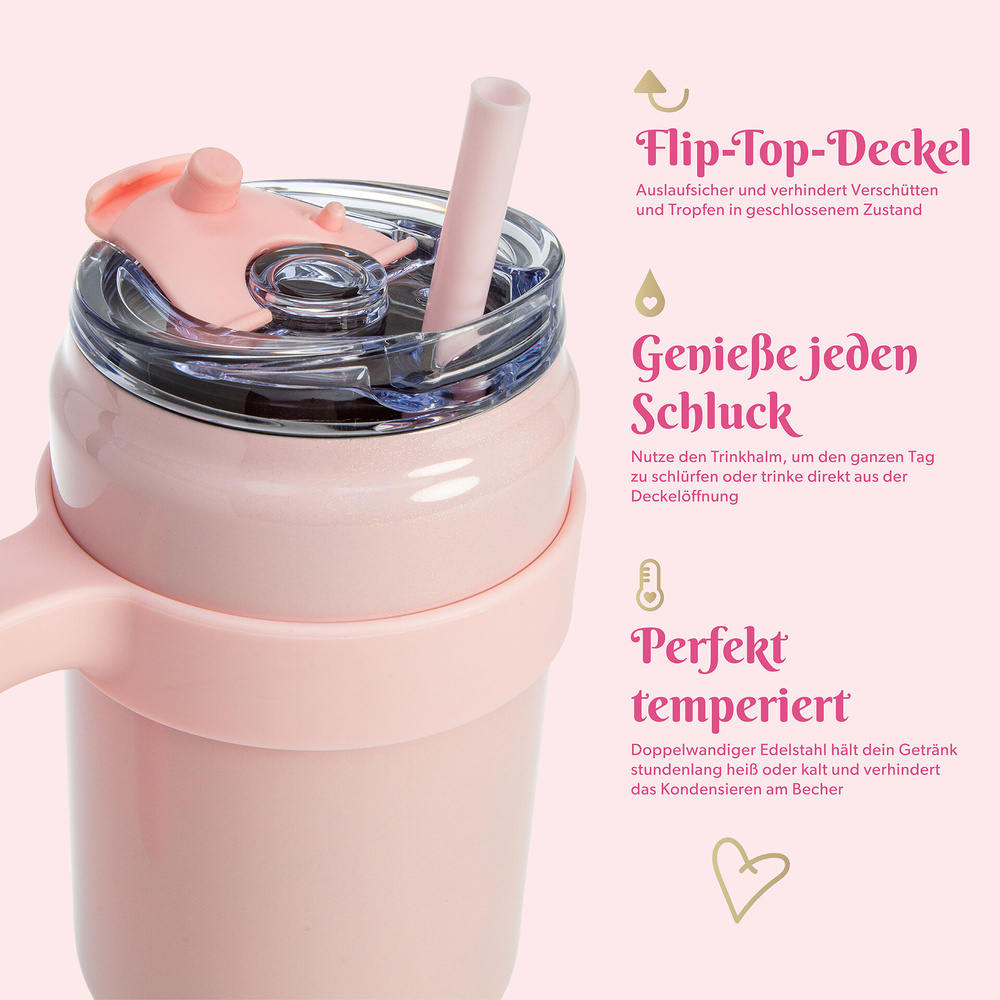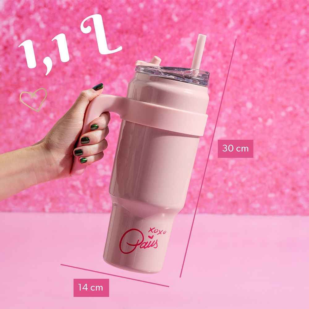 - Zainwestuj w modny termosowy kubek na wynos w różowym kolorze, który dzięki podwójnej izolacji utrzyma Twoje napoje w idealnej temperaturze, a jego pojemność 1 litra sprawi, że zawsze będziesz mieć ulubiony napój pod ręką!