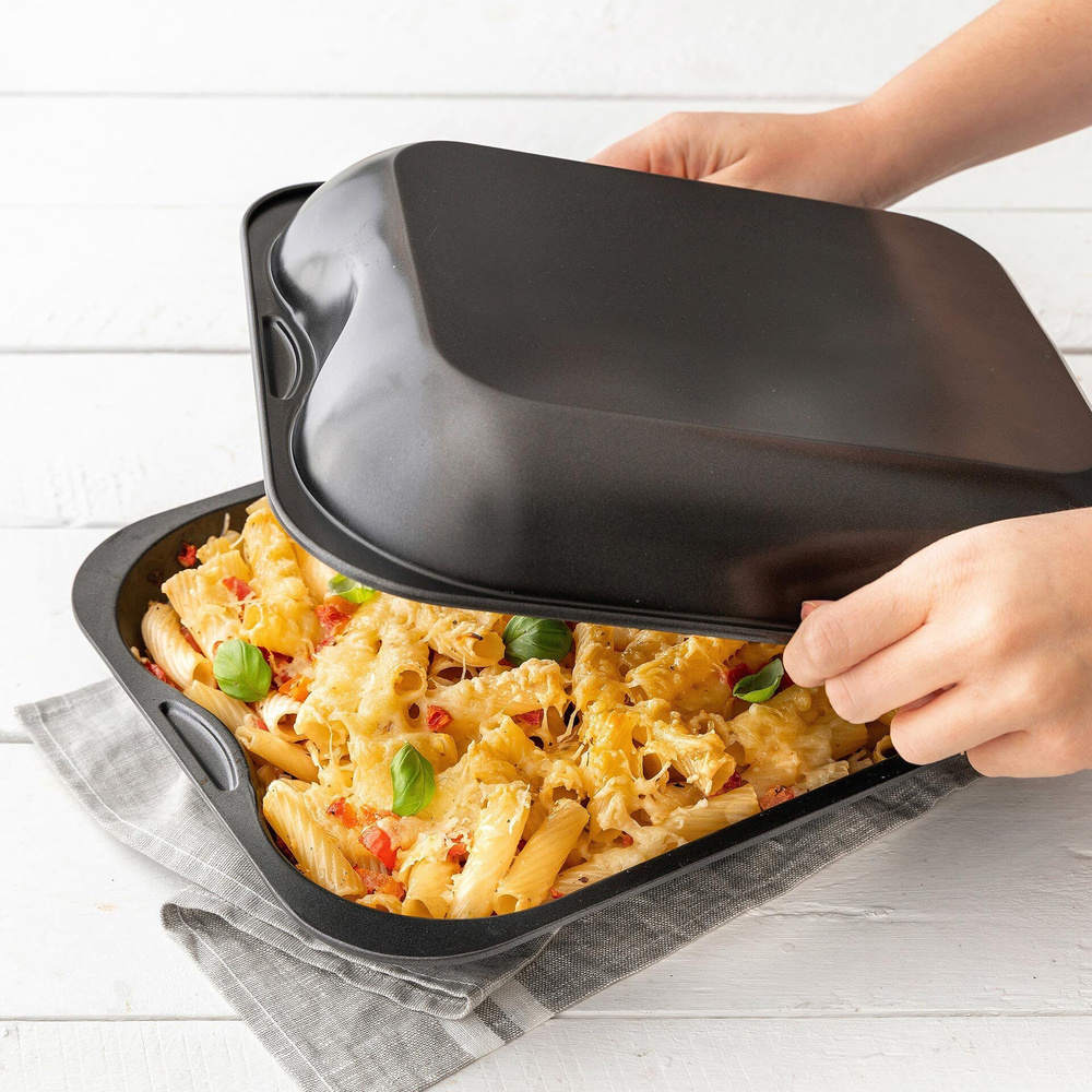 Forma idealnie nadaje się do przygotowywania zapiekanek z różnorodnymi składnikami, takimi jak ziemniaki, makaron, mięso czy warzywa. Możesz ją również wykorzystać jako pokrywkę, łącząc ją z drugą formą.