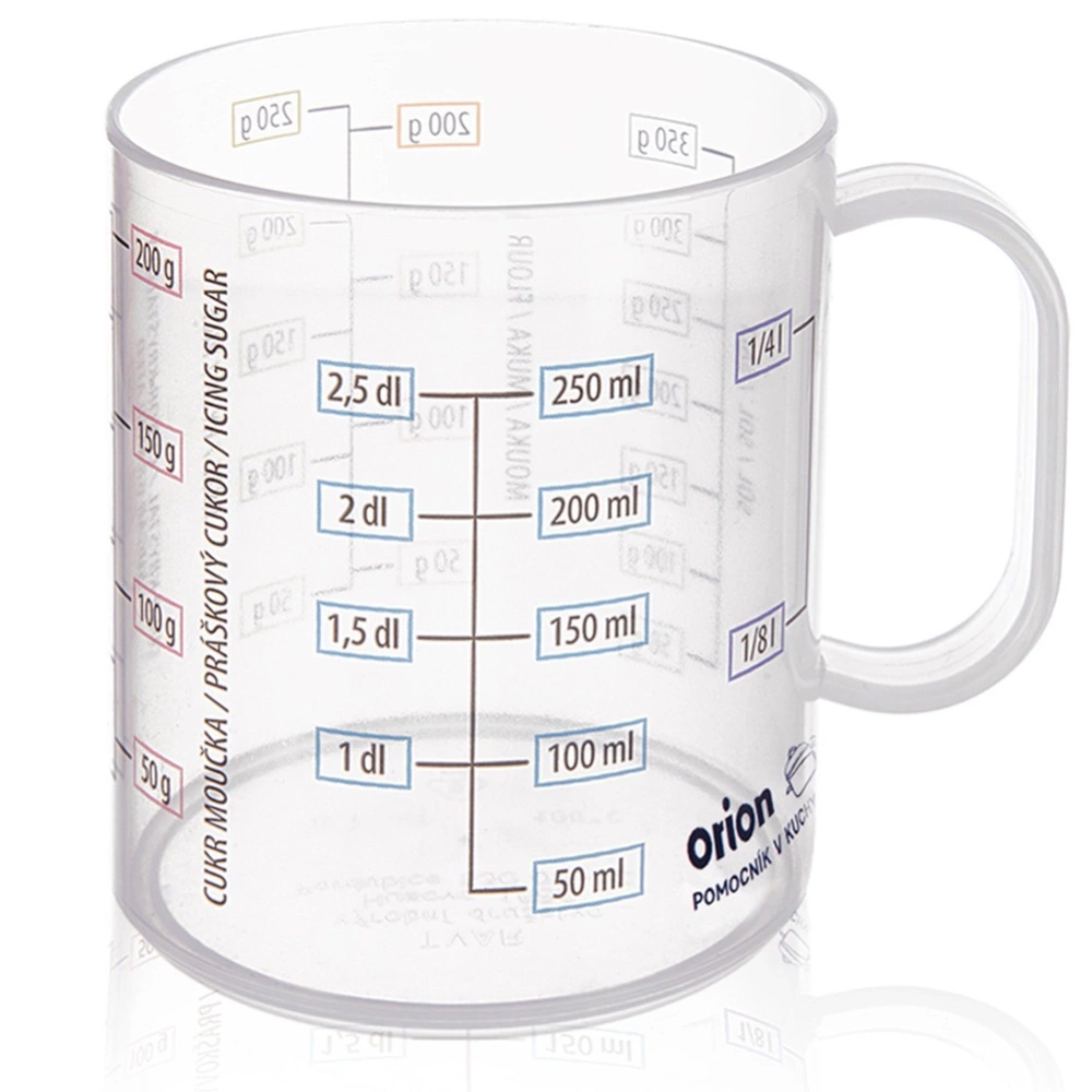 Kubek z miarką ułatwia precyzyjne odmierzanie składników sypkich i płynnych. Dzięki wyraźnej podziałce umożliwia kontrolę ilości dodawanych produktów, co jest szczególnie ważne podczas pieczenia i przygotowywania dań wymagających dokładnych proporcji. Sprawdzi się zarówno w kuchni domowej, jak i w gastronomii, zapewniając wygodę i dokładność podczas gotowania. Oryginalny produkt czeskiej marki Orion. Wyprodukowano zgodnie z europejskimi standardami.