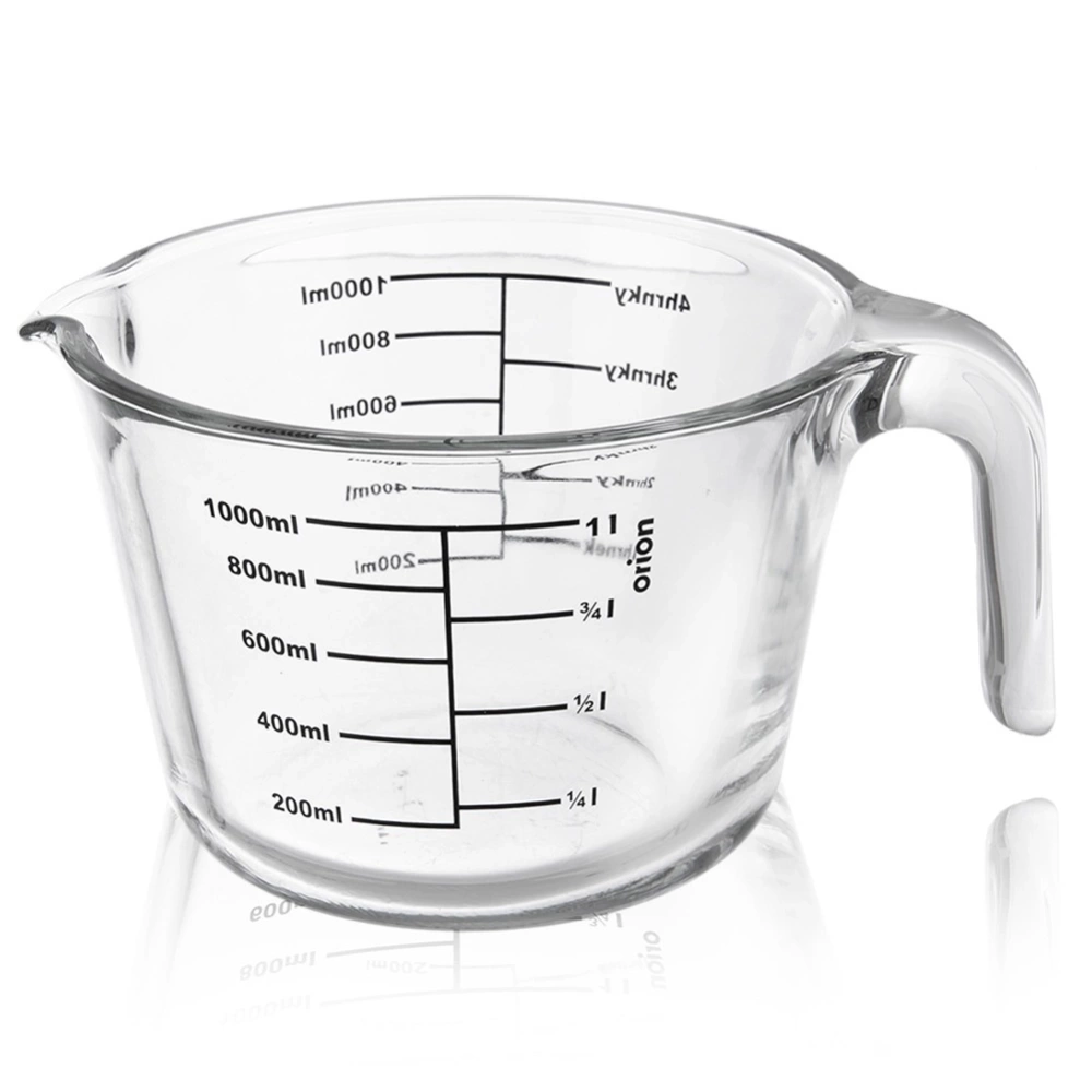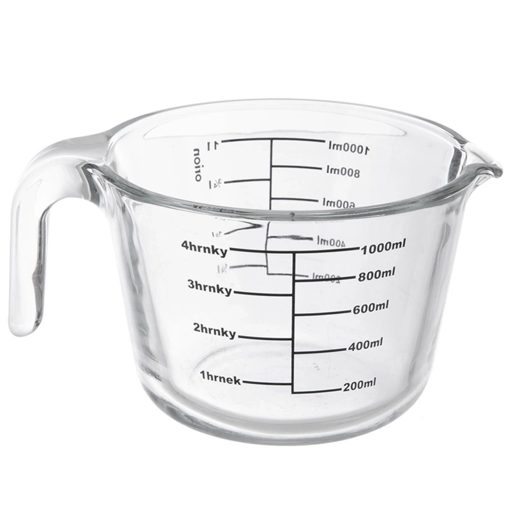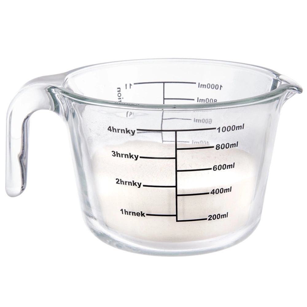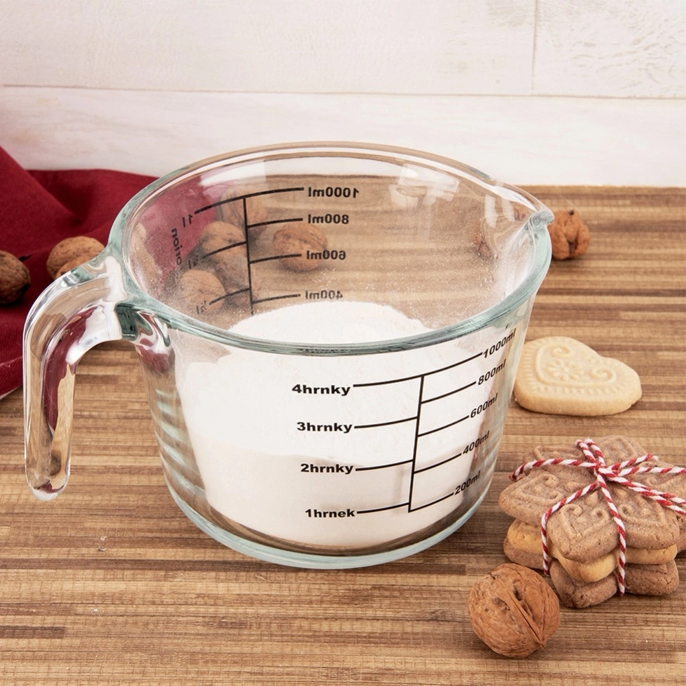 - Precyzyjna i wyraźna miarka - Naczynie posiada widoczną podziałkę w czarnym kolorze, która pozwoli odmierzyć ciecz w mililitrach od 200 do 1000 ml (z podziałką co 200 ml), w litrach od 1/4 l do 1 l oraz w kubkach od 1 do 4.