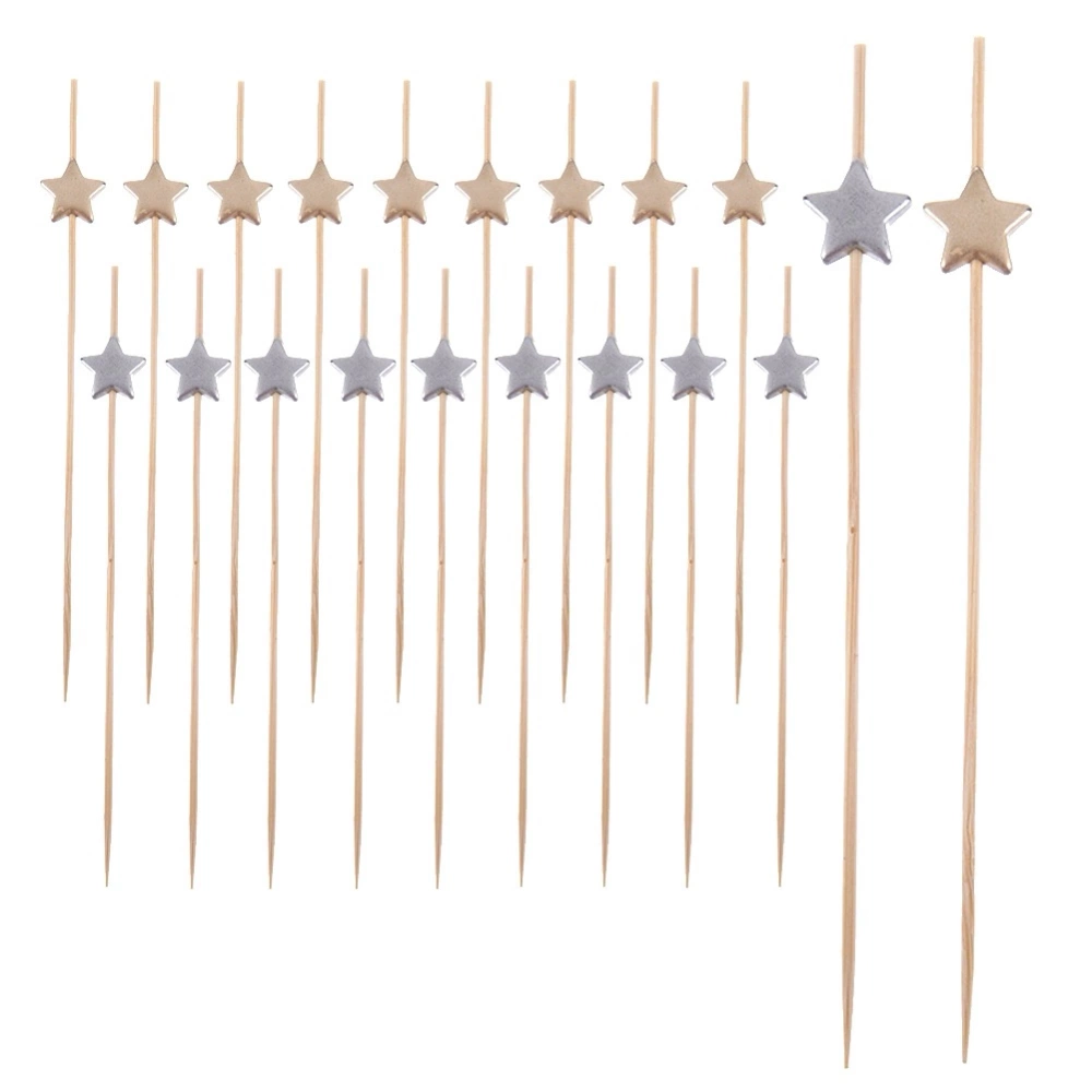 - Zestaw 20 wykałaczek do przekąsek o długości 12 cm z ozdobami w kształcie gwiazdek srebrnych i złotych. Idealne do serwowania koreczków, serów, owoców i muffinek.