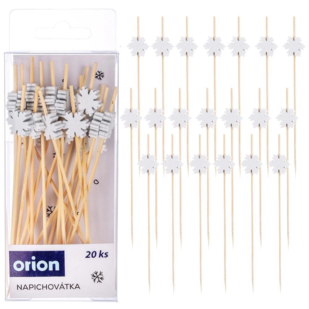 - Zestaw 20 wykałaczek do przekąsek - Zestaw dwudziestu wykałaczek z ozdobami w kształcie płatków śniegu, doskonałe do serwowania słonych i słodkich przekąsek podczas przyjęć, spotkań i uroczystości. Każda wykałaczka ma długość 12 cm.