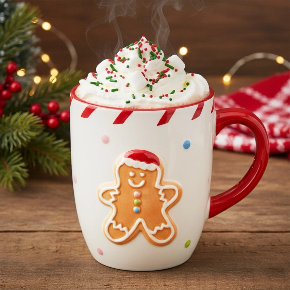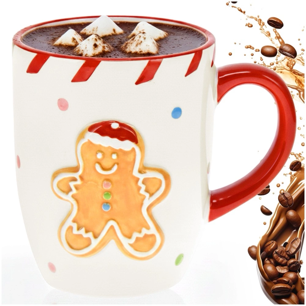 - Kubek świąteczny z motywem piernika - Kubek z uchem do picia napojów, świetnie sprawdzi się w codziennym użytku. Kubek ma maksymalną pojemność 330 ml i wymiary 11,5 x 8,5 x 10 cm. Idealny do picia herbaty, kawy, kakao oraz innych napojów. To idealny towarzysz zimowych wieczorów.