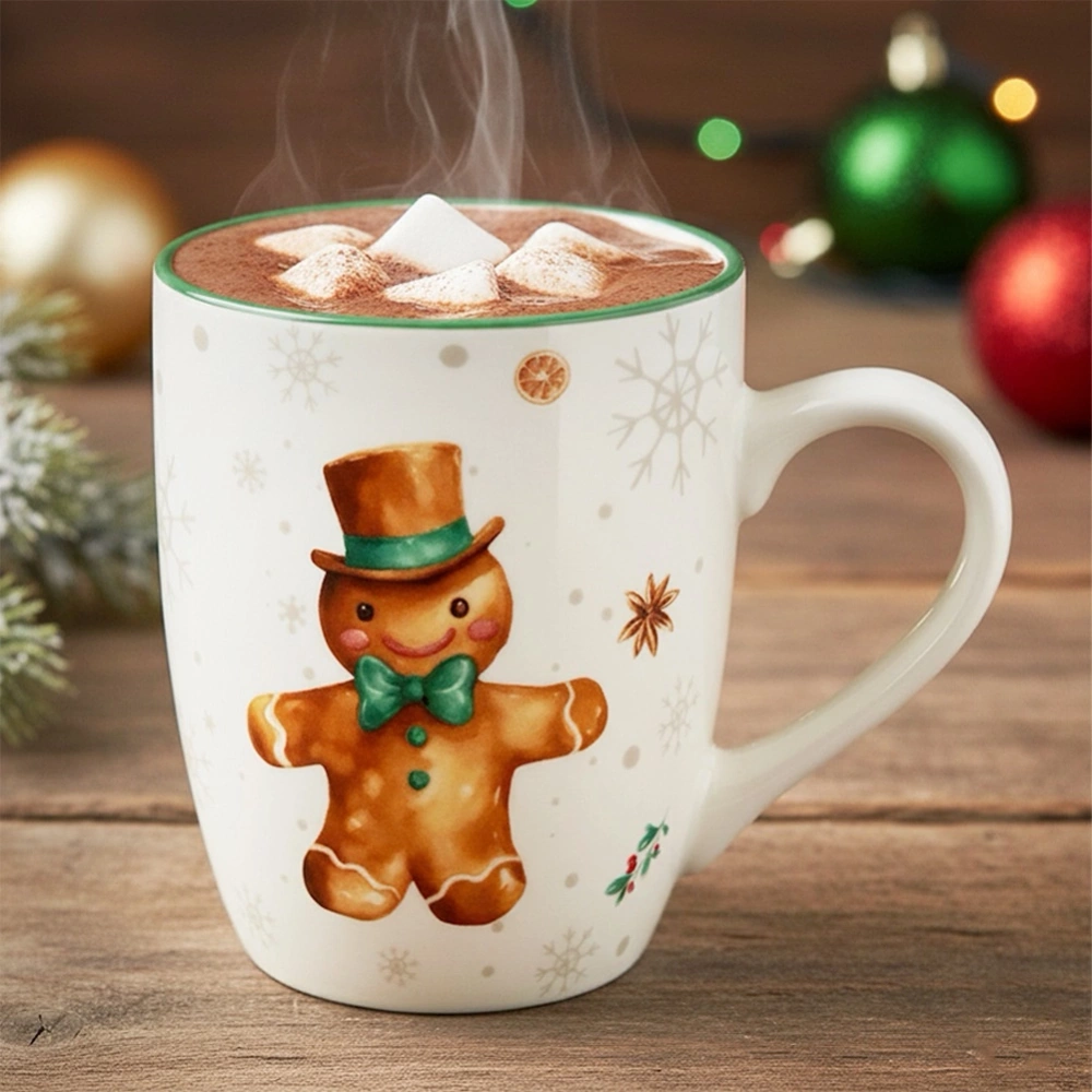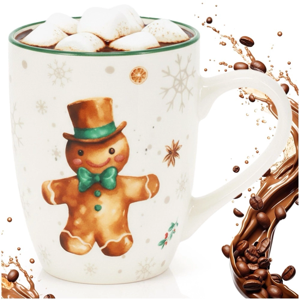 - Porcelanowy kubek o pojemności 320 ml z motywem Piernikowego ludzika oraz zielonym rantem. Kubek nadaje się do zmywarki oraz mikrofalówki.