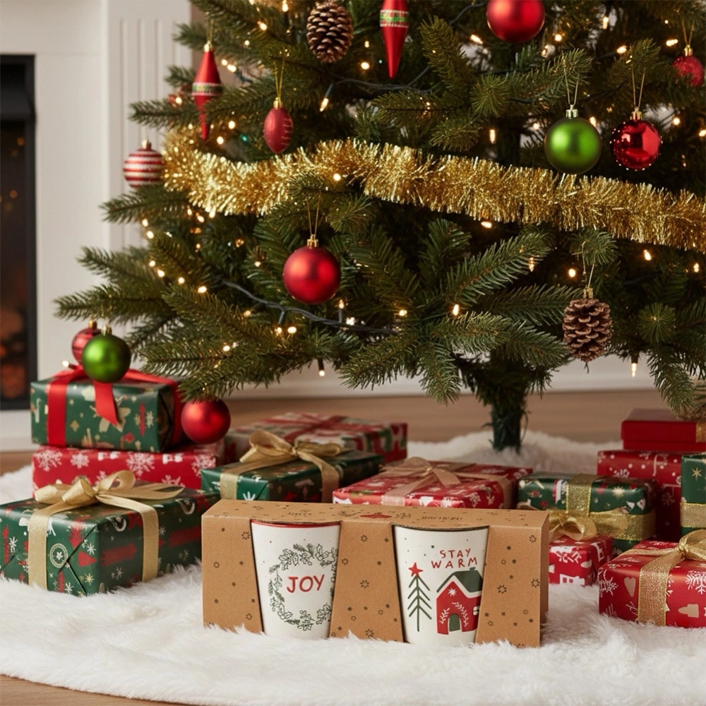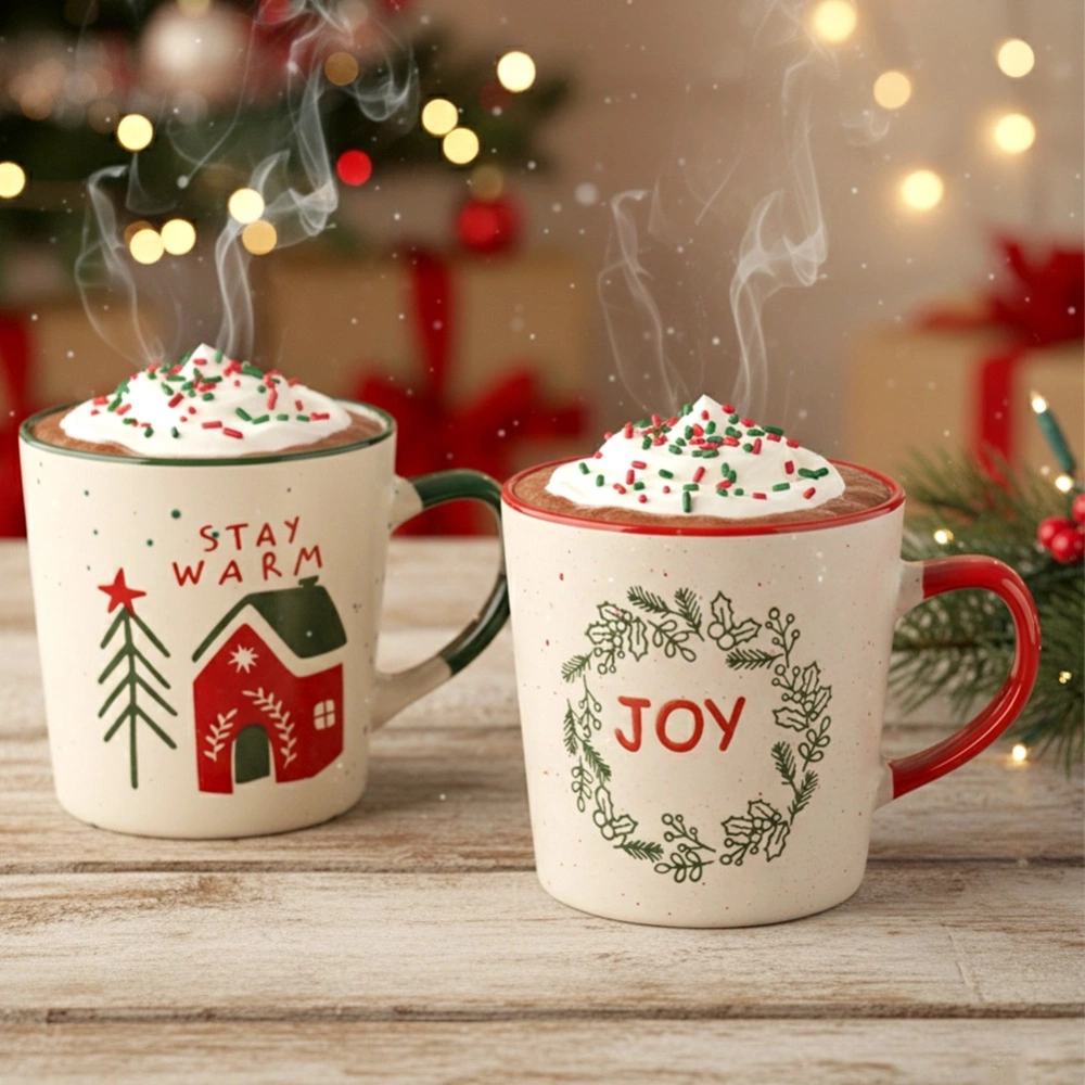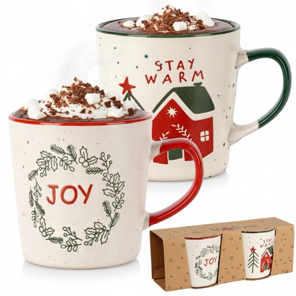 - Zestaw 2 kubków świątecznych - Zestaw dwóch kubków z uchem do picia napojów, świetnie sprawdzą się w codziennym użytku. Kubki mają pojemność maksymalną 350 ml i wymiary 12 x 9 x 9 cm. Kubki ozdobione są świątecznymi napisami i dekorem ('JOY', 'STAY WARM'). Idealne do picia herbaty, kawy, kakao oraz innych napojów.