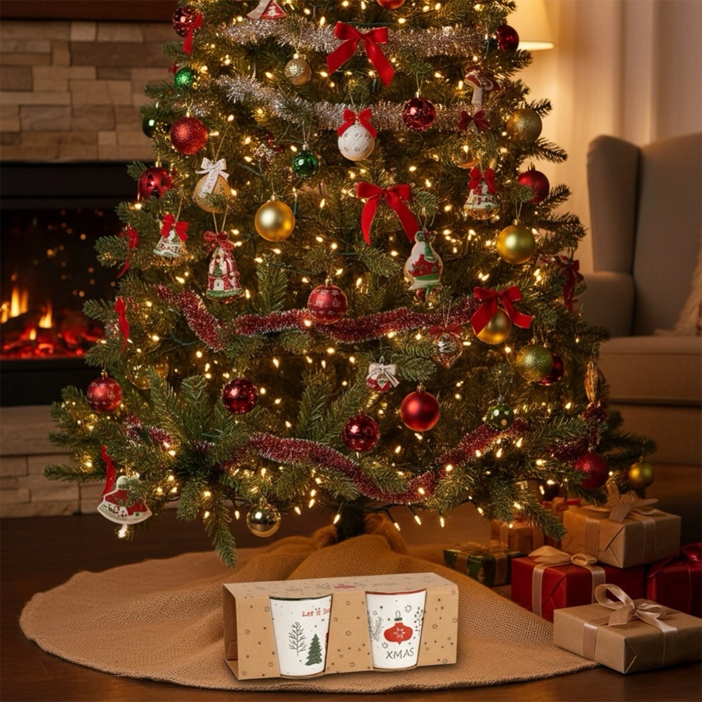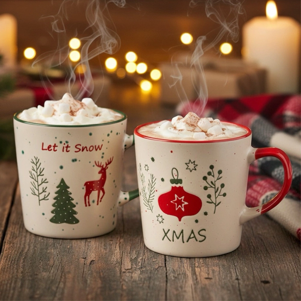 - Zestaw 2 kubków świątecznych - Zestaw dwóch kubków z uchem do picia napojów, świetnie sprawdzą się w codziennym użytku. Kubki mają pojemność maksymalną 350 ml i wymiary 12 x 9 x 9 cm. Kubki ozdobione są świątecznymi napisami i dekorem ('LET IT SNOW', 'XMAS'). Idealne do picia herbaty, kawy, kakao oraz innych napojów.