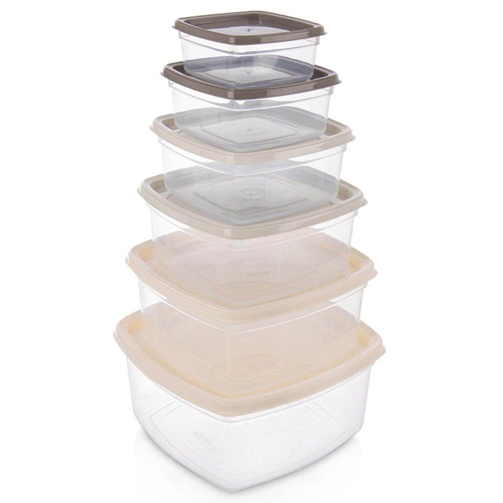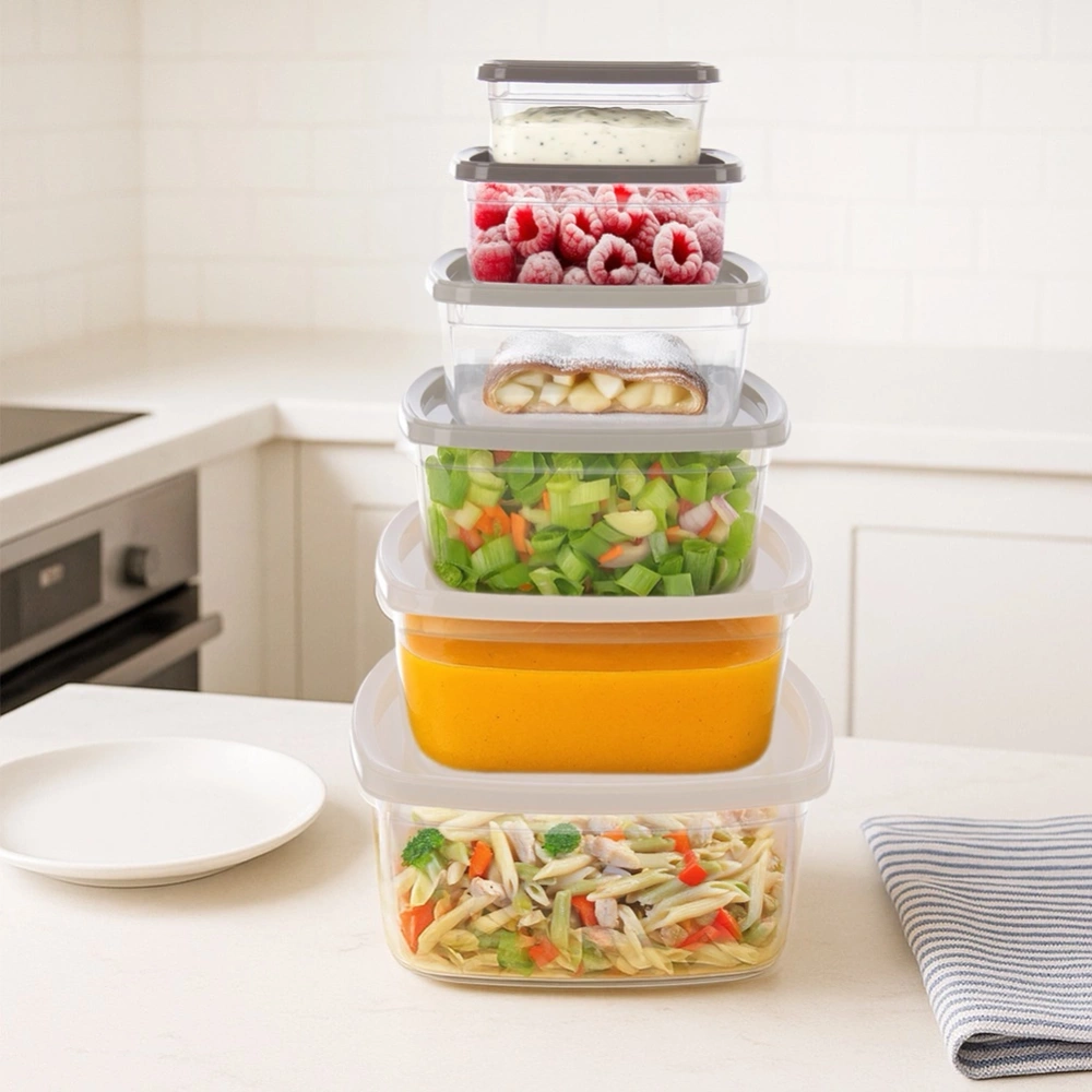 - Zestaw 6 pojemników na żywność - Zestaw sześciu pojemników kuchennych z pokrywkami do przechowywania żywności i produktów sypkich. W zestawie pojemniki w różnych pojemnościach (3,2 l , 2,1 l , 1,35 l , 850 ml, 500 ml i 275 ml). Pojemniki można wygodnie przechowywać umieszczając je w największym pojemniku.