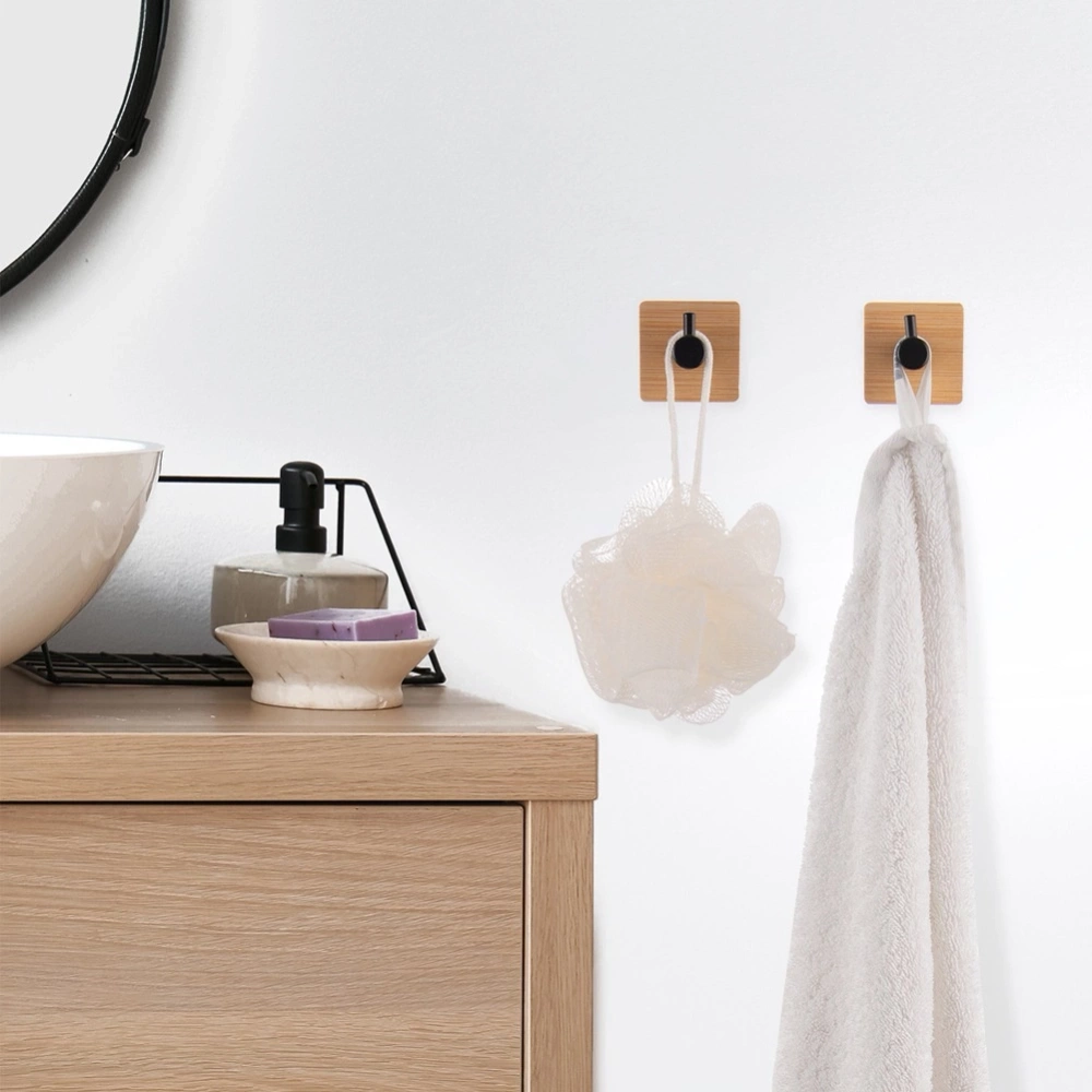 - Zestaw 2 haczyków posiadających samoprzylepną powierzchnię. Idealne do wieszania ręczników i ścierek w kuchni oraz łazience. Wykonane z drewna bambusowego i metalu.