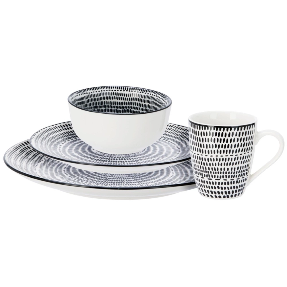 - Zestaw dla 4 osób niezbędny podczas śniadań, obiadów i kolacji. Wykonany z porcelany z efektownym geometrycznym wzorem. Składa się z 16 elementów.