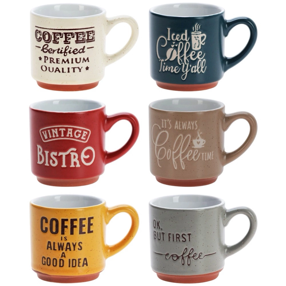 - Zestaw kolorowych kubków do kawy typu espresso o pojemności 110 ml. Kubki wykonane z ceramiki w różnych kolorach z efektownymi napisami.