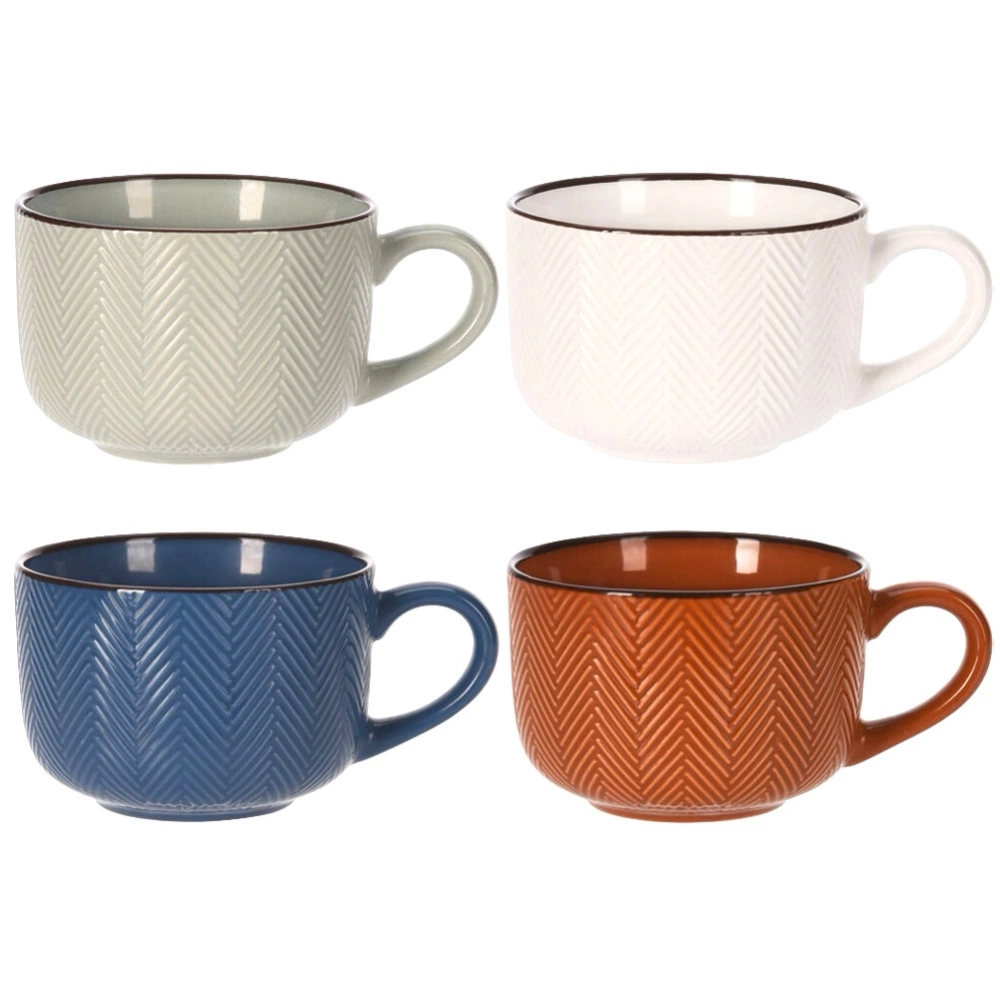 - Zestaw 4 kubków o pojemności 560 ml - Zestaw czterech kubków z uchem do picia napojów, idealnych do codziennego użytku w dwóch kolorach. Kubki mają wymiary 15 x 11,5 x 8,7 cm. Maksymalna pojemność każdego kubka wynosi 560 ml. Kubki są idealne do picia herbaty, kawy, kakao oraz innych napojów.