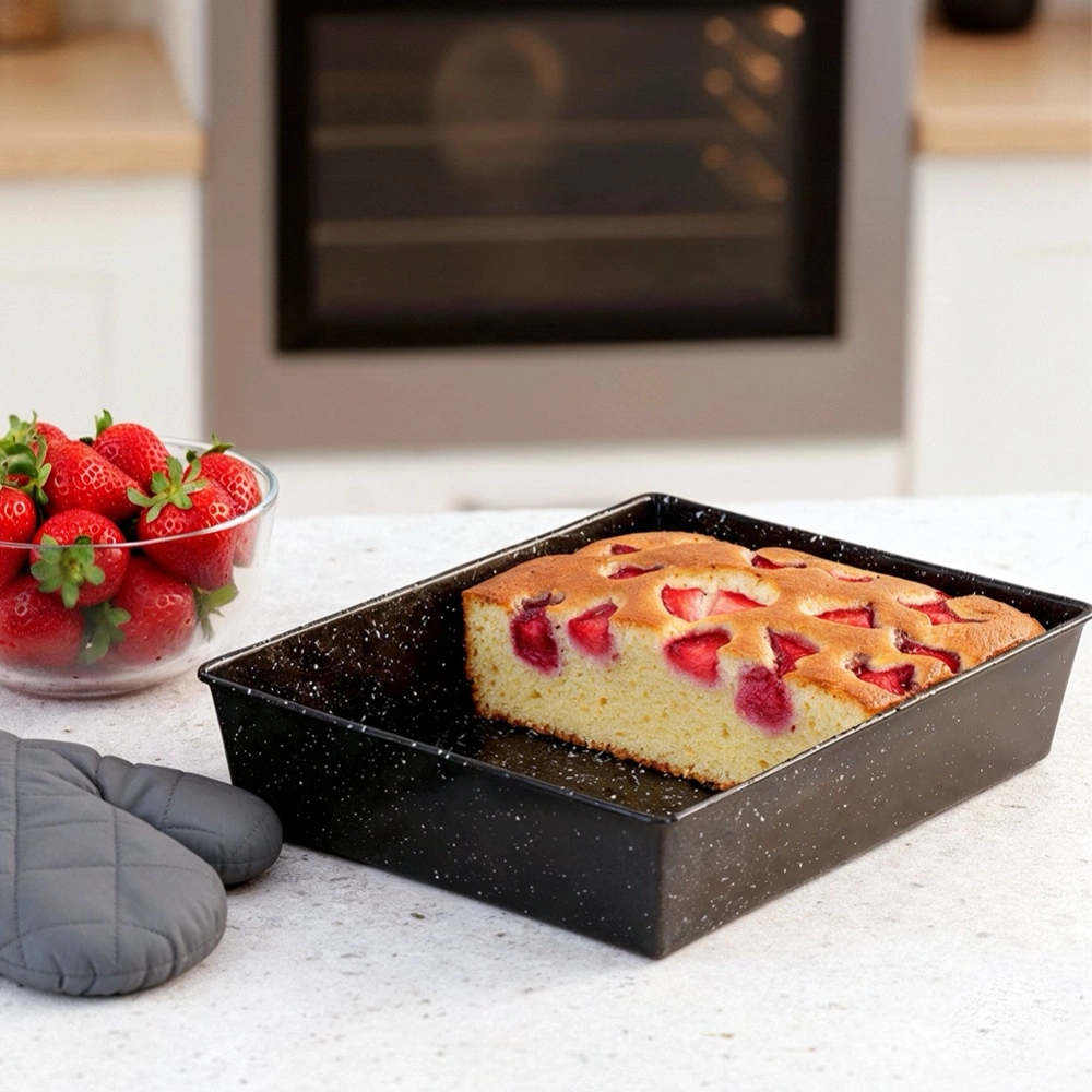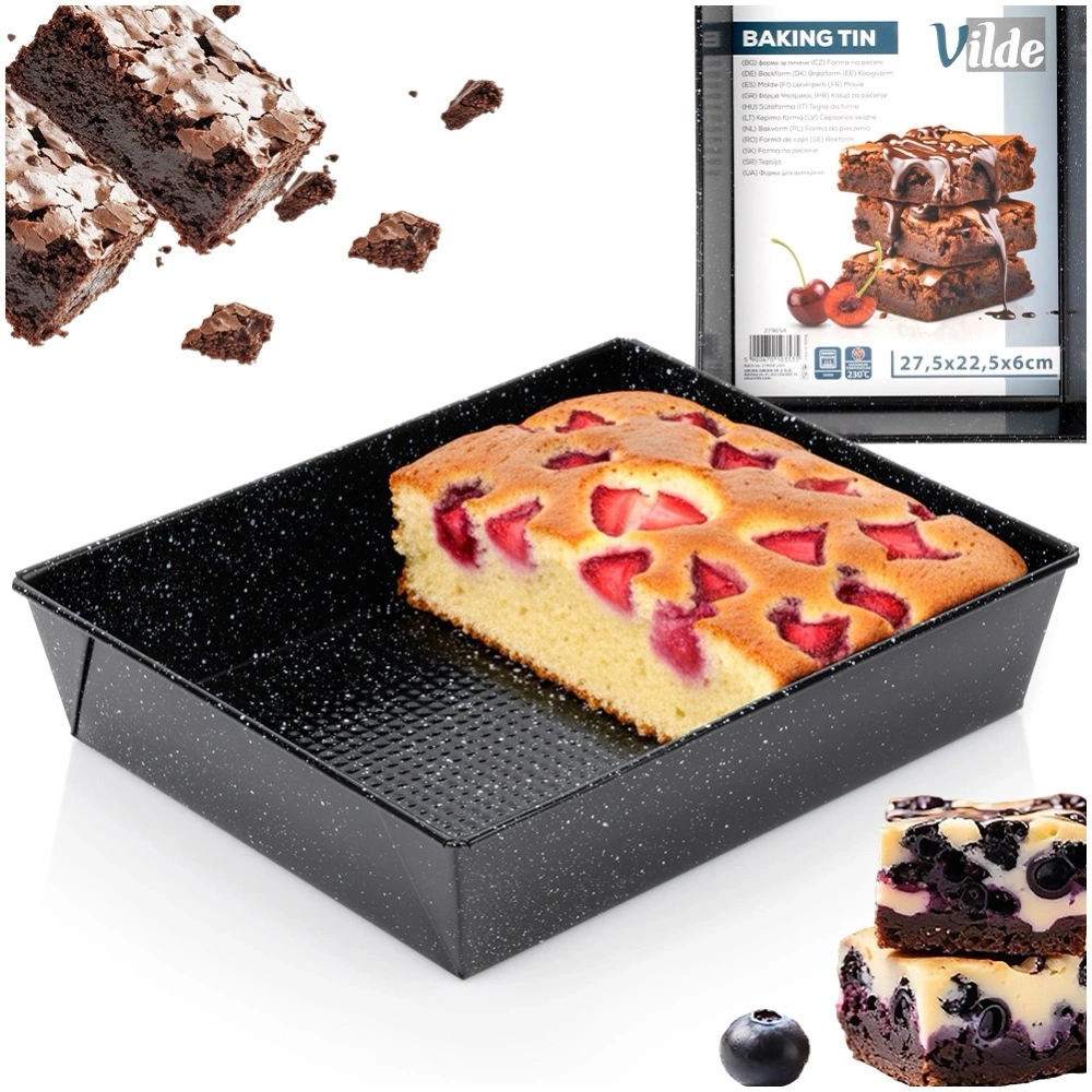 - Prostokątna forma do pieczenia wykonana ze stali węglowej z powłoką granitową. Idealna do wypieku ciast, deserów, zapiekanek czy mięs. Posiada nieprzywierającą powłokę.