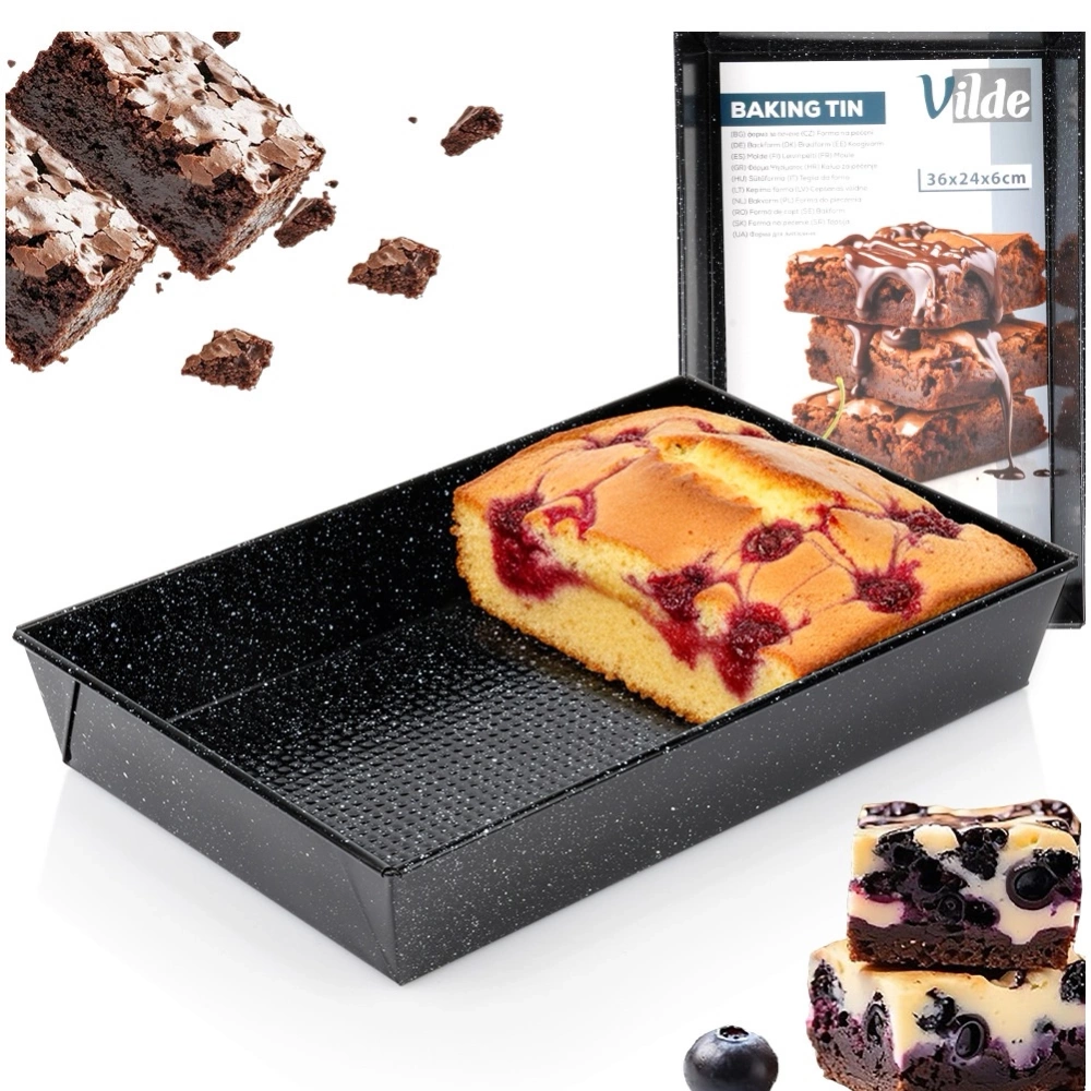 - Prostokątna forma do pieczenia wykonana ze stali węglowej z powłoką granitową. Idealna do wypieku ciast, deserów, zapiekanek czy mięs. Posiada nieprzywierającą powłokę.
