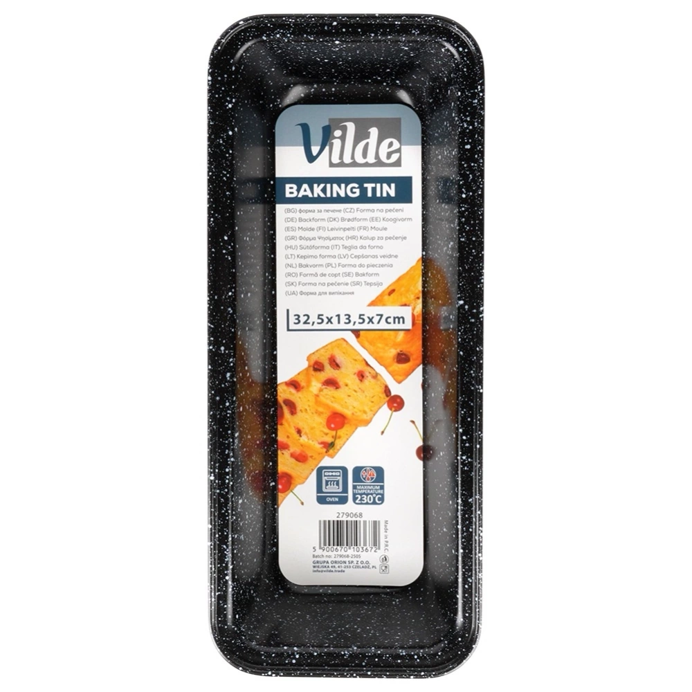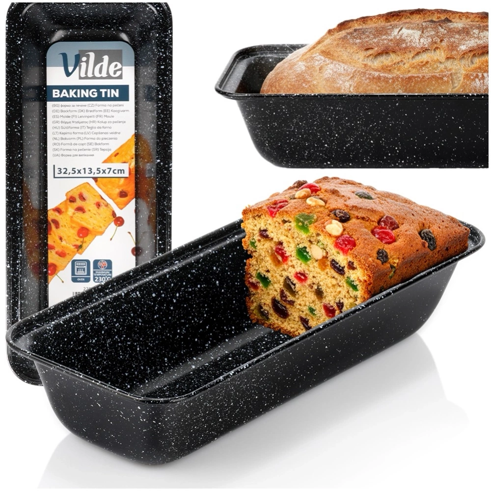 Prostokątna forma do pieczenia chleba, pasztetu, ciast ucieranych oraz drożdżowych. Idealna do pieczenia również babki. Odpowiedni kształt formy pozwoli na upieczenie keksu lub pasztetu w odpowiednim kształcie. Po wyjęciu z niej wypieki będą prezentować się niezwykle efektownie. Łatwa w czyszczeniu i wygodna w użytkowaniu. Oryginalny produkt marki Vilde. Wyprodukowano zgodnie z europejskimi standardami.