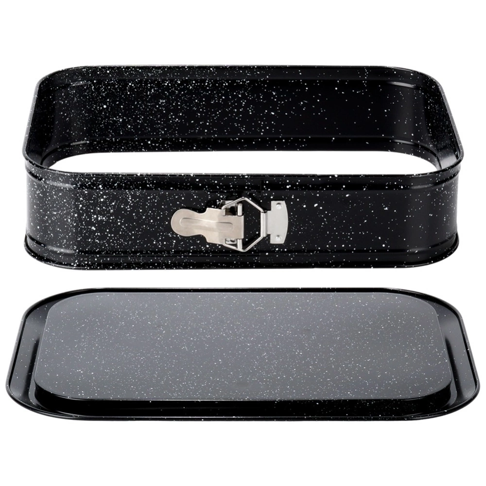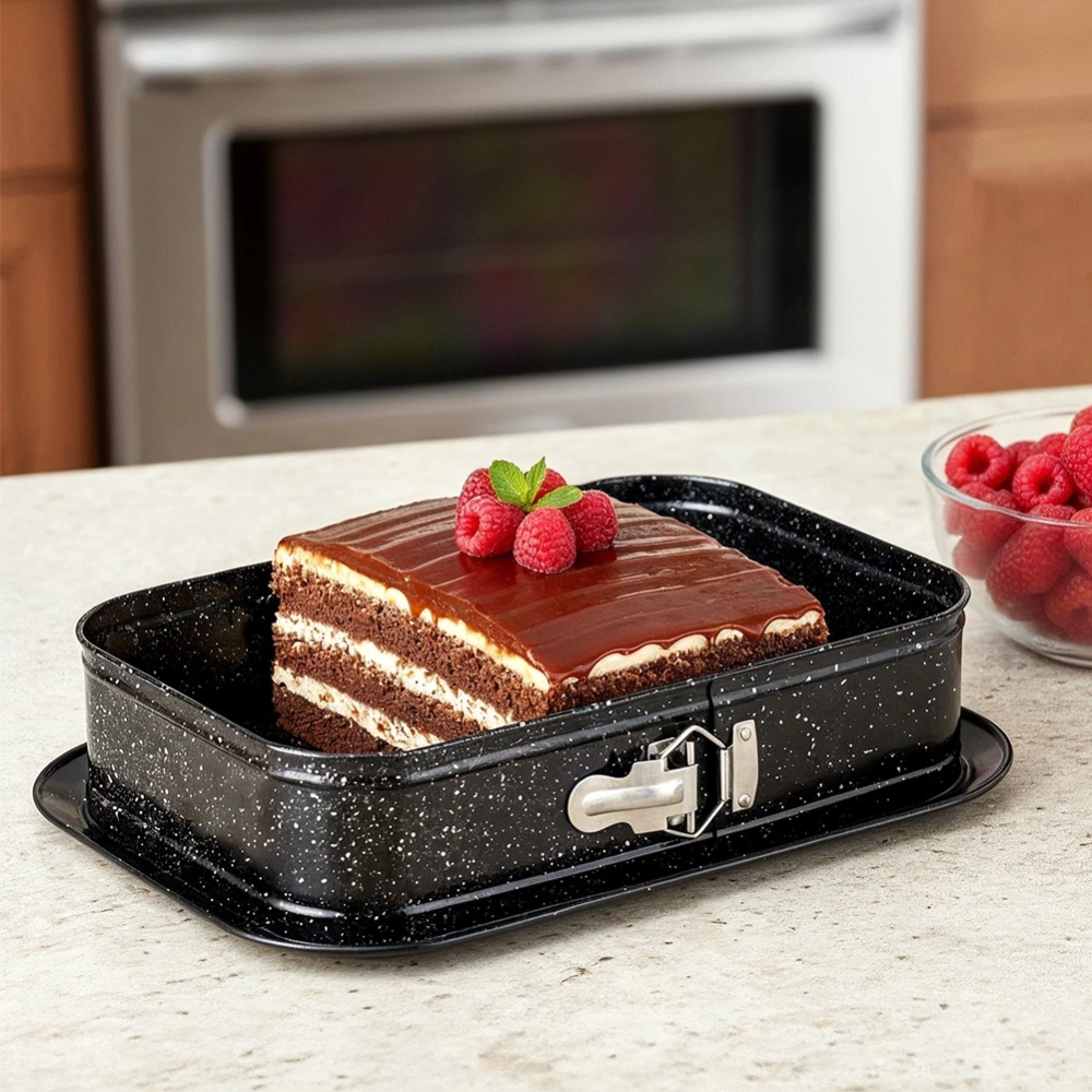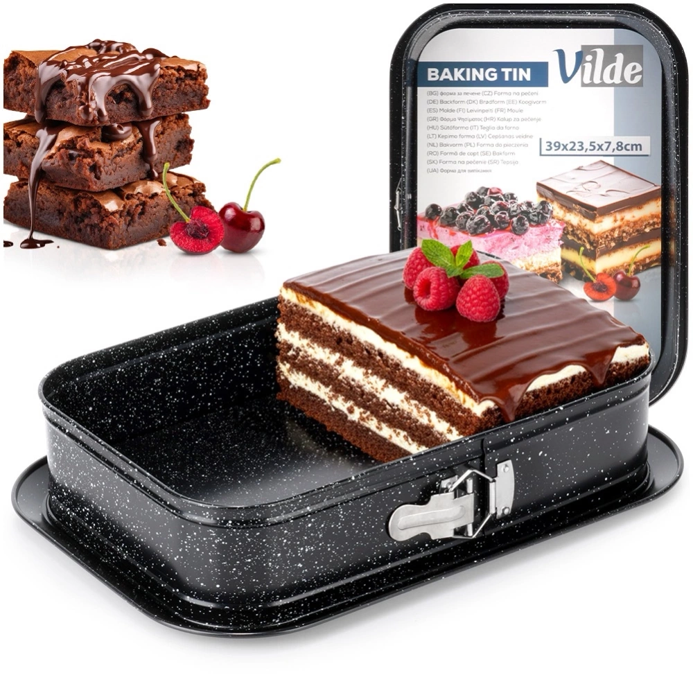 - Prostokątna forma do pieczenia ciast z granitową powłoką. Brzegi tortownicy są rozpinane. Forma nadaje się do piekarników gazowych oraz elektrycznych.