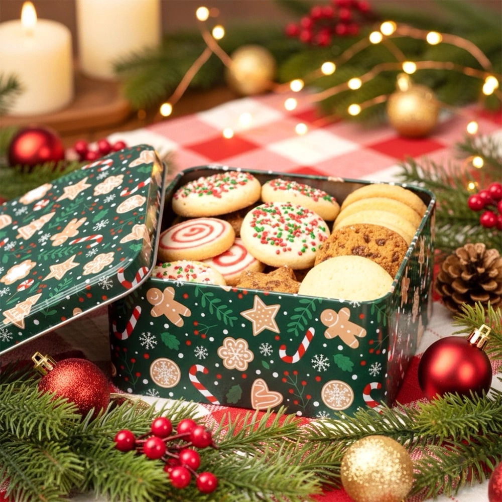 - Zamykany pojemnik w formie puszki ze świątecznym dekorem. Idealny do przechowywania ciastek, pierniczków oraz drobiazgów.