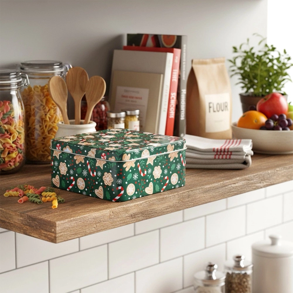- Pojemnik w formie puszki ze świątecznym motywem - Praktyczna puszka do przechowywania ciasteczek, słodyczy, herbaty oraz drobiazgów. Idealna do wykorzystania w kuchni, biurze lub jako ozdobne pudełko prezentowe. Pojemnik ma wymiary 15 x 15 x 6,5 cm.