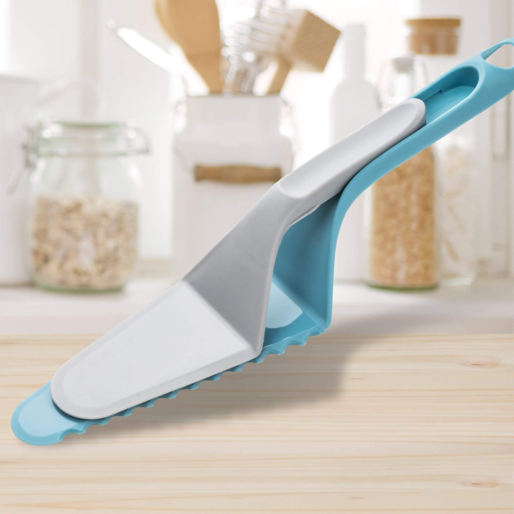 Łopatki łączą się ze sobą, aby bezpiecznie zsunąć kawałek ciasta, wystarczy delikatnie przesunąć mniejszą z nich do przodu.