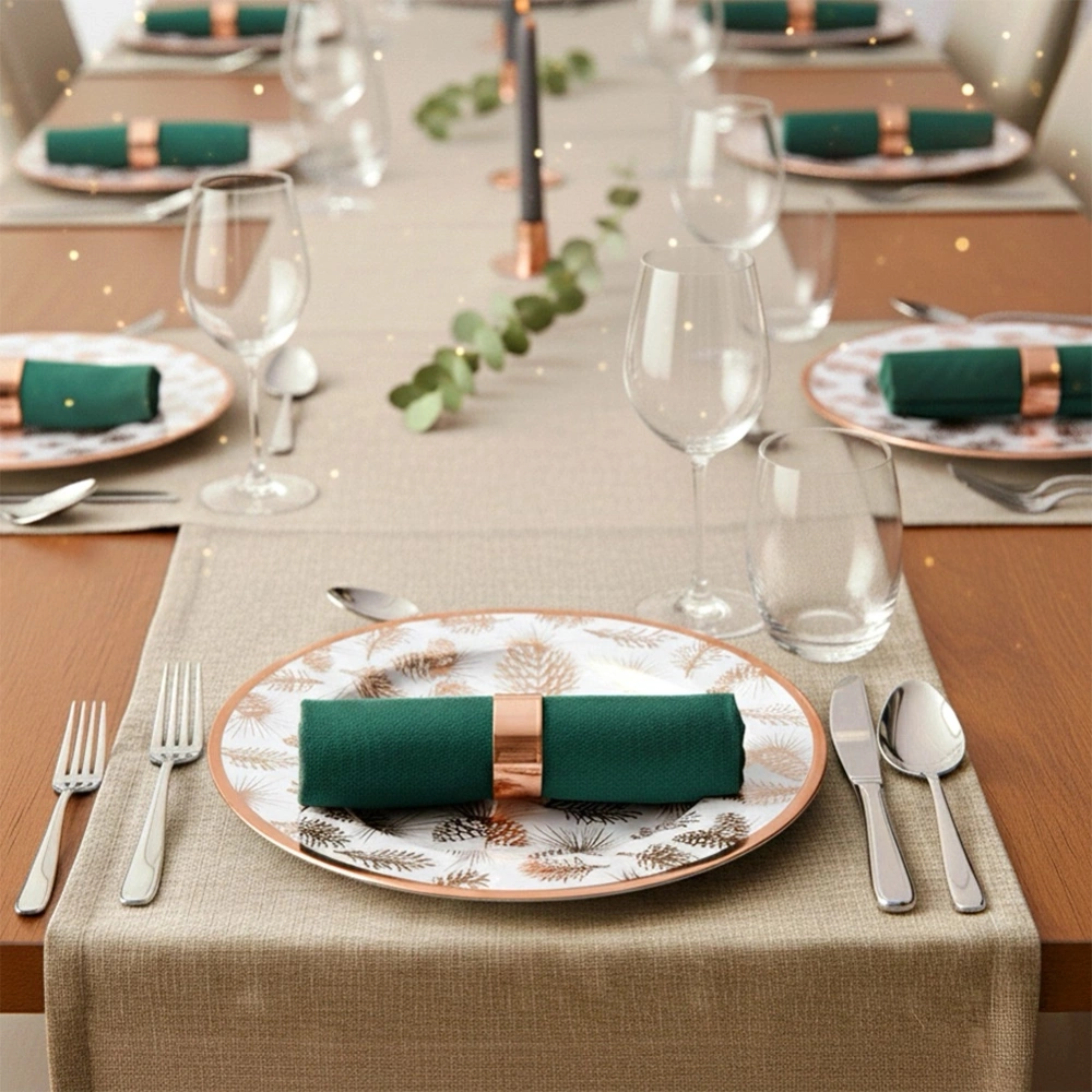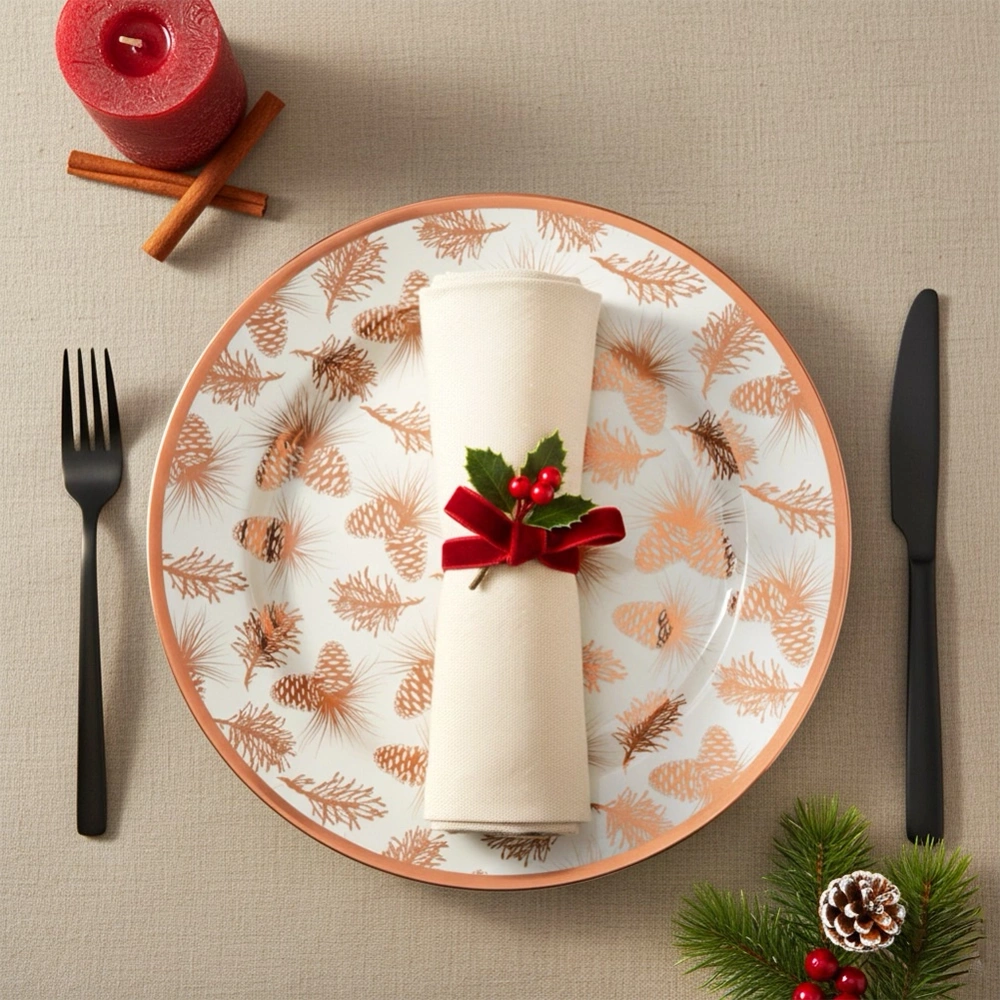 - Dekoracyjna podkładka pod talerze o średnicy 33 cm. Wykonana z wysokiej jakości tworzywa w białym kolorze z miedzianym dekorem w kształcie szyszek.
